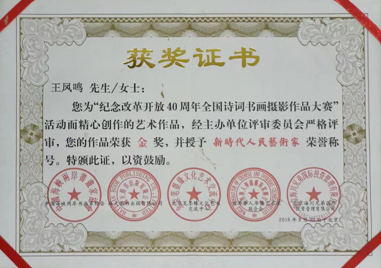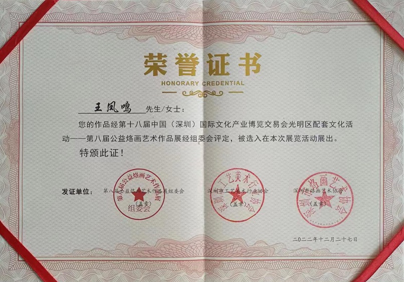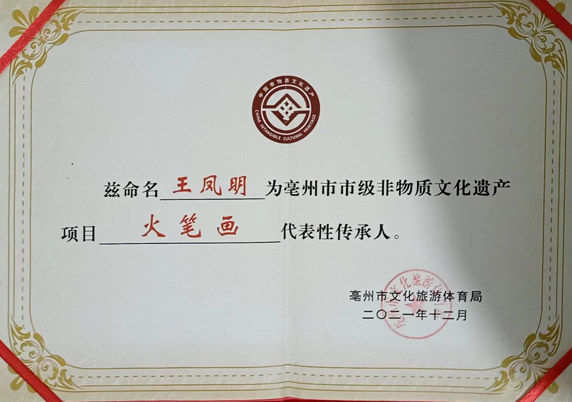 1968年入伍,从当兵开始,在军营里做黑板报,写写画画,退伍后,开始在木板上烙画,家具上做画。从拿起画笔算起,王凤鸣在绘画的道路上,已经走过了48个年头。几十年来,因家境不好,他吃了不少尽苦,生活的磨难,但丝毫没有动摇他对烙画艺术的追求。