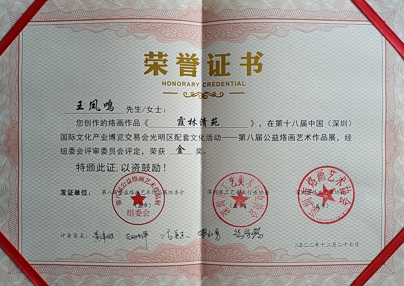 1990年参加中国函授大学国画专业,深得名师指点,着力攻研烙画,逐步将西方油画和中国烙画融会贯通,打破传统独创淡彩反复套烙工艺,使作品独创一新,作品多次参加各级大展,有多幅作品入省展、国展,先后八次获奖,编印出版多种烙画作品集,作品被人民大会堂和多个国家政要所收藏。