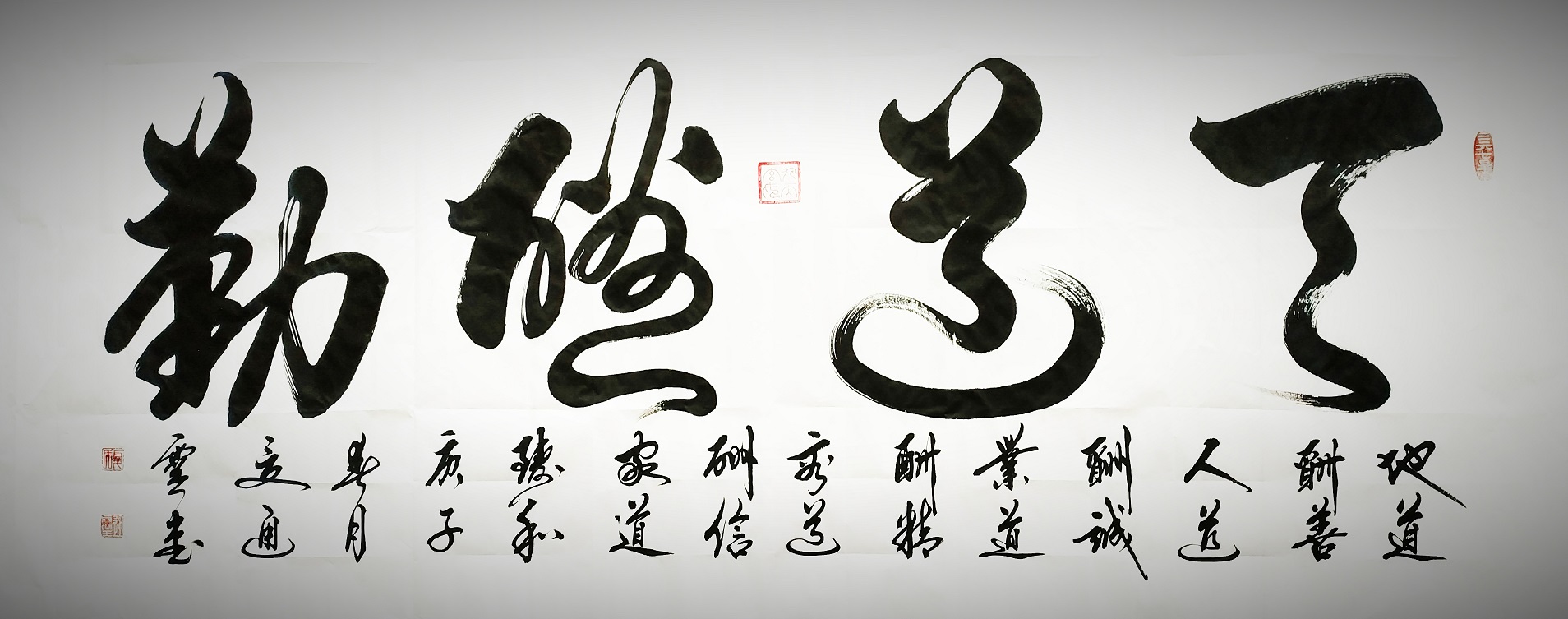 2018年创了通灵书画院,被中央电视台CCTV授权为国礼创作基地!中国国际书画艺术教育培训基地!中国楹联学会夏道胜书画艺术工作室,中国首批文化名人书画工作室!全国少儿美术技能测评基地,2019年在北京参加了不忘初心易学风水研讨会,2019年被评为易经行业影响力人物,2019年书法作品参加“园丁颂——曼谷行”展出!2019年作品“精气神”“临江仙”“中国梦”又被马来西亚办公厅永久收藏!2019年8月参加翰墨飘香,多彩华夏暨全国书画作品展,2019年12月在福州参加了第三届世界非遗文化展,等!多次参加国展和各地书画展活动,被誉为实力派书法家。作品被邮政和各大媒体生产邮册和刊物发行!各大报刊和大型文献书籍全国发行!国家图书馆和全国新华书店展示销售!作品被人民日报社选做台历和楹联学会选做新春礼包发放到各大机关!作品被各界人士收藏,作品润格为3.2万元至3.6万元每平尺!
