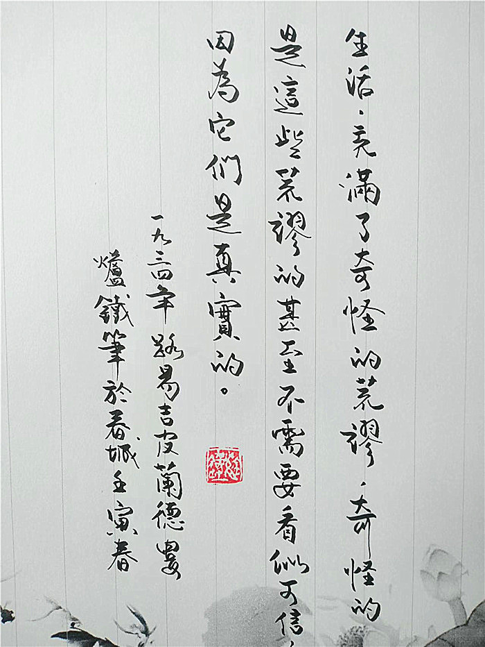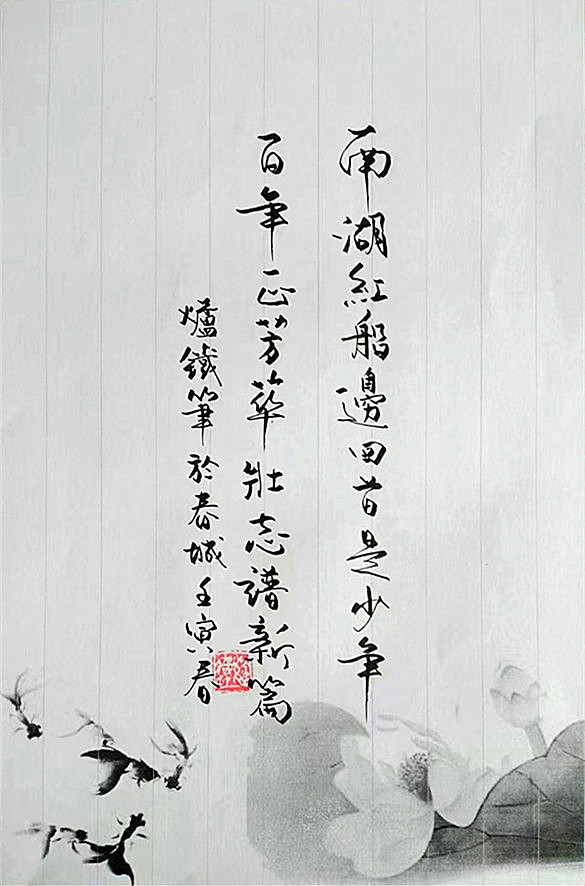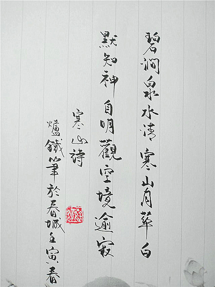 吴泽兵,男,汉族,笔名:炉铁,生于重庆市涪陵区,个人经商,坚持硬笔书法创作四十年,师古:颜真卿,米芾,唐寅,王羲之,苏东坡,文征明等。从今:当代书法大家杨再春先生。在专业平台发表论文25篇,书法作品500个系列。坚持以法造势,以势显气,以气通韵,以韵达意,以意修神,以神证道的书道修炼观点。