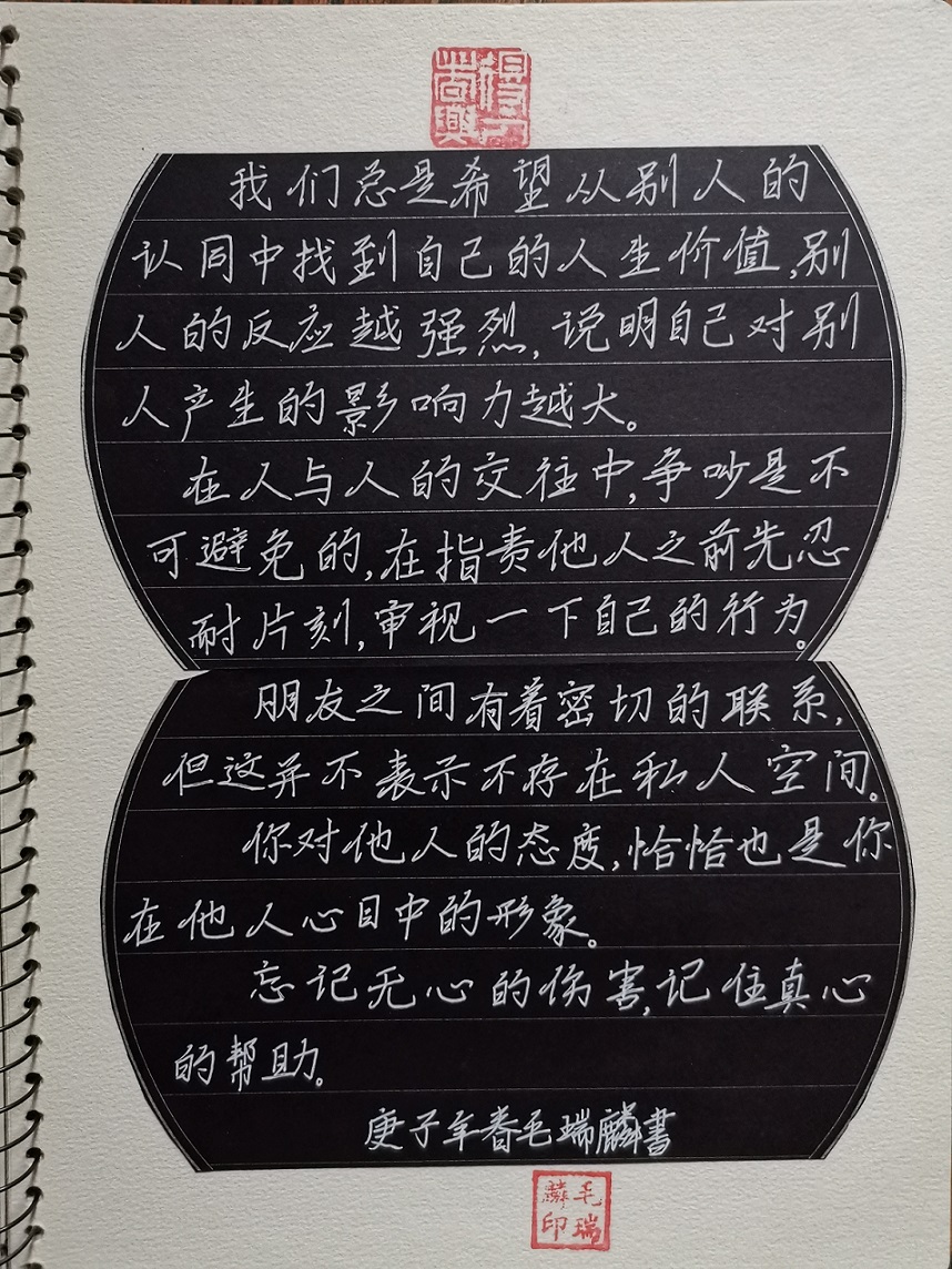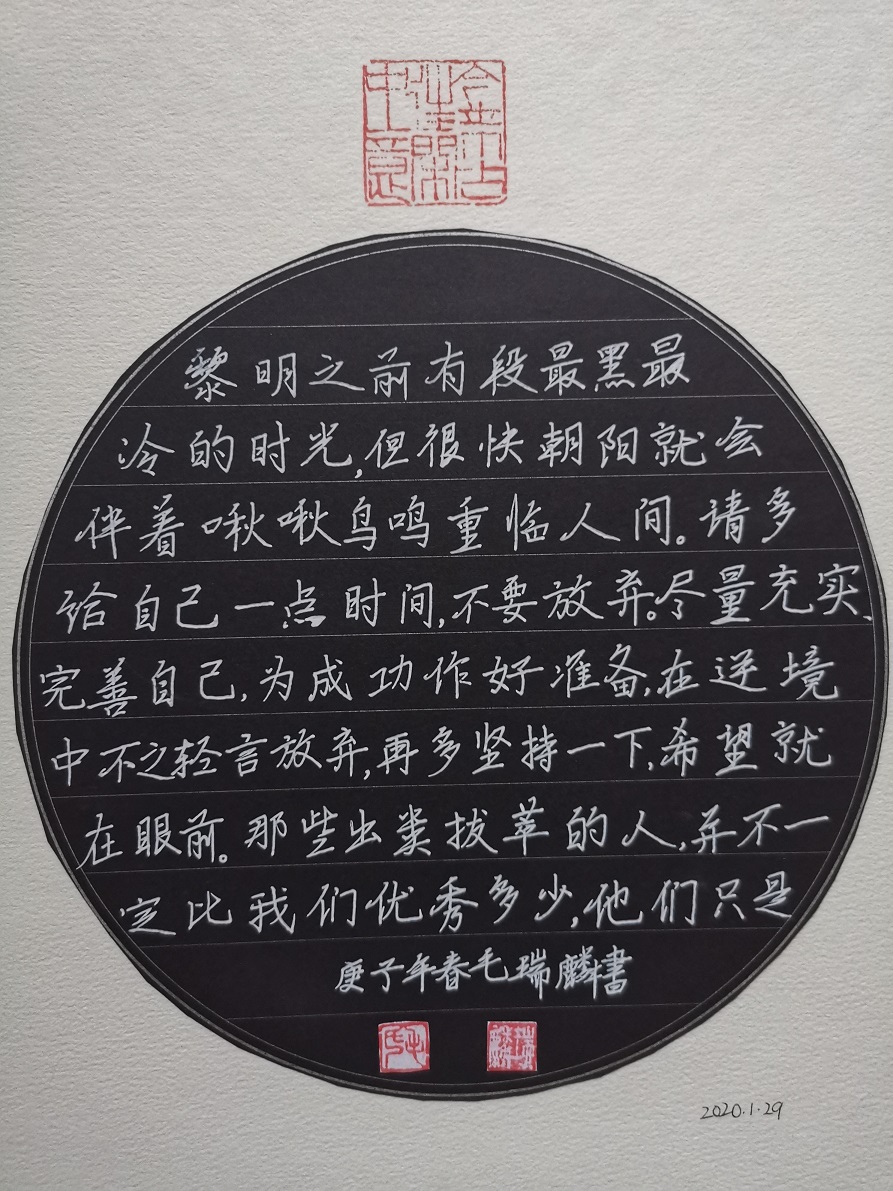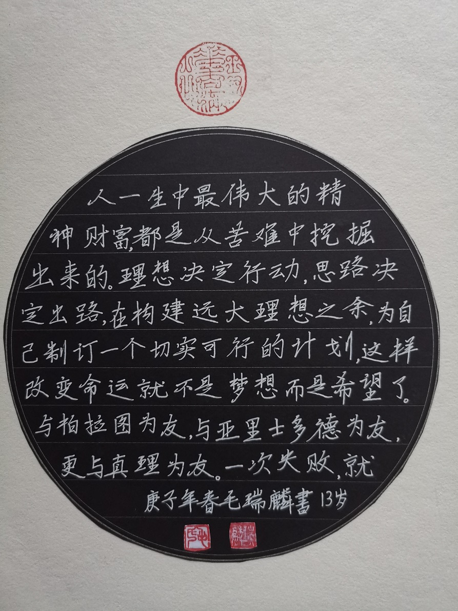毛瑞麟,男,汉族,重庆大足人,2007年2月出生,现就读于广东省东莞市光正实验学校初中部。目前为中国硬笔书法协会青少年组会员,中国书画联谊会青少年分会会员,自幼受父亲毛登华先生影响而习书法,书法作品曾在镇、市、省、全国获奖30余次,作品也入展于《青少年书法杂志》、《语文报》、《书法报》、《书法报?硬笔书法》举办的大型书法赛事之中。
