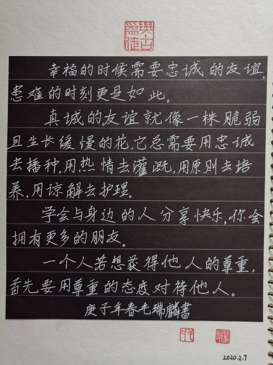 2020年在第四届全国书法、硬笔书法网络大赛中荣获少年组二等奖