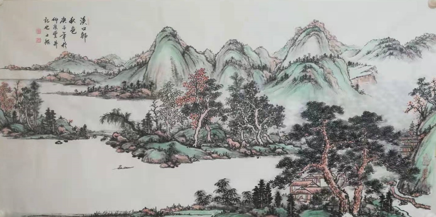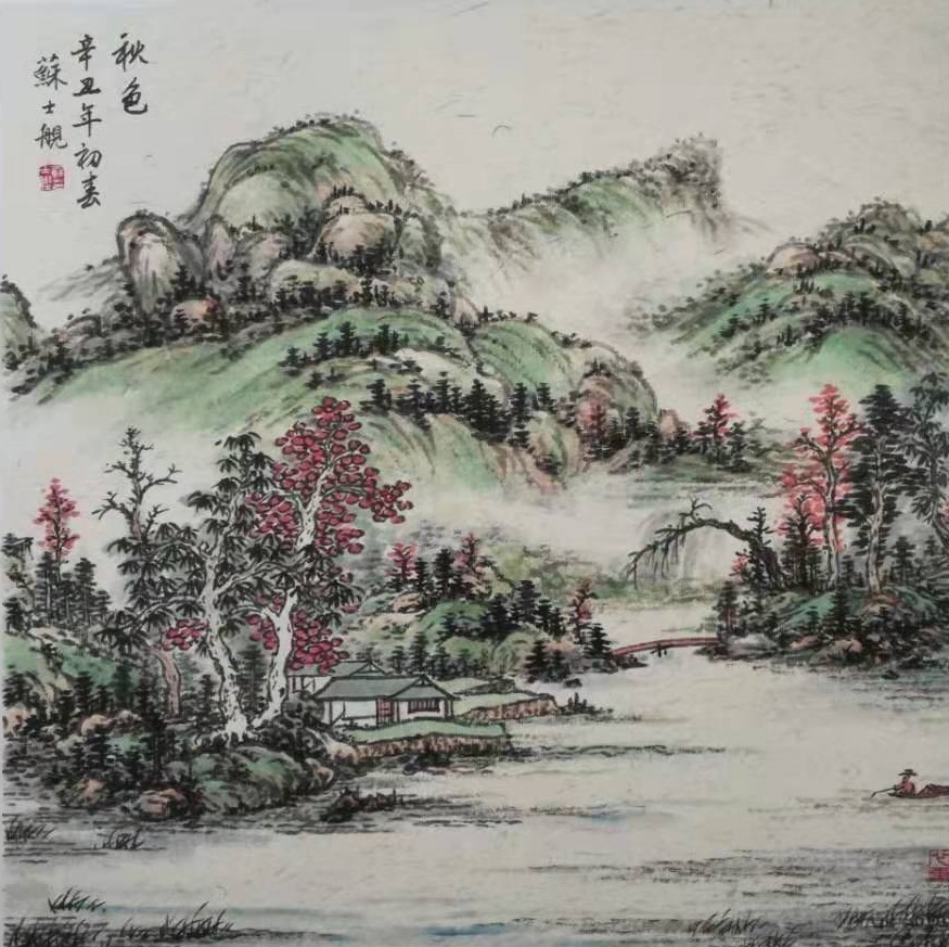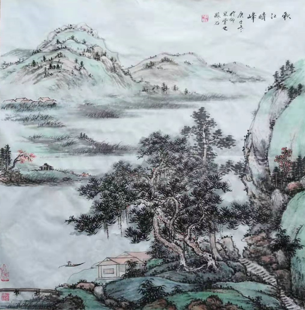 又有水为道、墨为器的水墨铺陈法度。善用水者如顺水行舟,不善用水者则如浅滩落船,划不得一浆。现在看苏士舰先生山水作品里的苍劲而且不失滋润的水墨属性,必然知道他的山水铺陈就有善于用水的玄机要妙。再以青绿作生机,画面就呈现出色不碍墨,墨不碍色的层次分明。一天清淑气,万里碧榆风,画里画外之山水总是东崖复沓蔽轻雾,西峰峥嵘喷流泉的气韵生动。随类赋彩果然可以为天地传神,为万物张目。在这种纤尘不染的臻妙山水里游目骋怀,必是澄怀观道的体验。独与天地精神往来,外师造化中得心源。诸如《秋江晴峰》、《绿水青山似故乡》都是笔墨精妙,设色雅致的山水似品。可以装饰万家屏障,极有文化弘扬的时代力量。