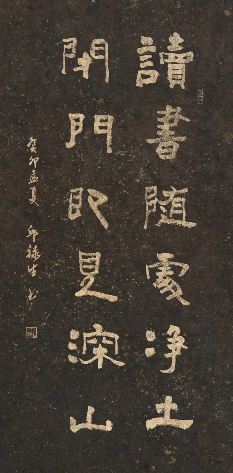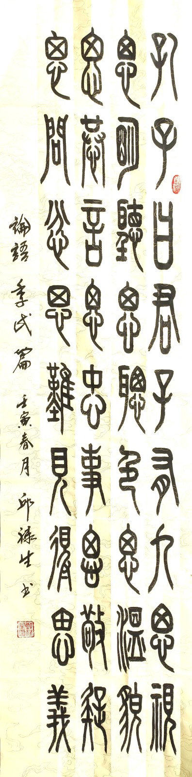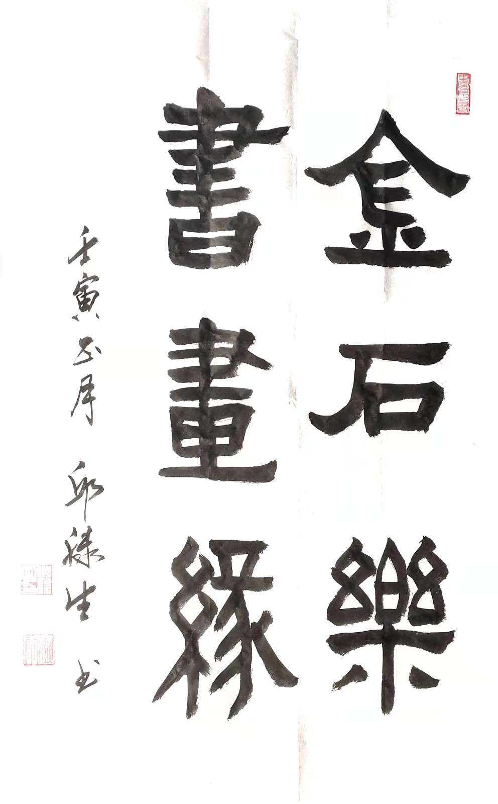 邱禄生自幼兴趣广泛,酷爱书画,对书法、篆刻、油画、国画山水、花鸟、诗词歌赋、鉴赏、评论等多有涉猎。数十年来,不渝初心,笔耕不倦,勤临古代碑帖,承其精髓,广纳博采,融会贯通,师古图新,遂成一体。工篆、隶,备精各体,榜书见长。他以坚韧不抜的毅力,坚持临习、吸收《乙瑛碑》 、《礼器碑》 、《张迁碑》 、《石门颂》 、《曹全碑》 、《史晨碑》、《汉帛》、《汉简》、《华山庙碑》等碑帖以及吴昌硕、陈鸿寿、伊秉绶等名家字帖精华基础上,逐步形成了自己的隶书风格。其篆、隶功底深厚,书风淳正,格调高雅,苍劲高古、浑厚大气;其行草笔墨雍容筋健、气韵清俊,儒雅洒脱。