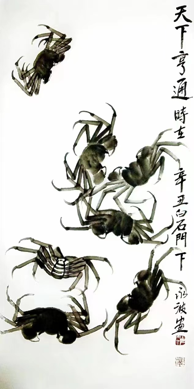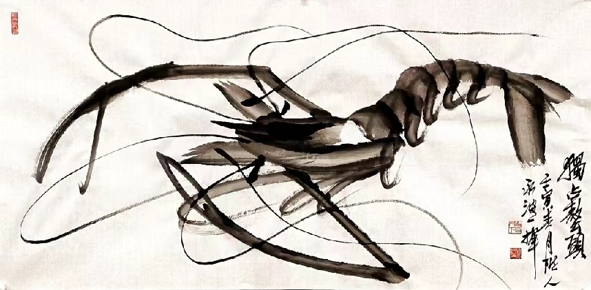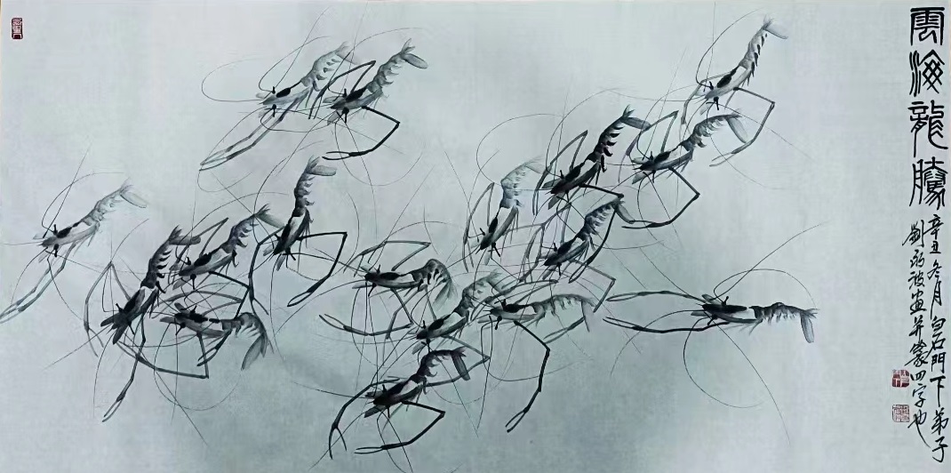 刘永波先生把自己的人生阅历和感悟融入到艺术当中,加上自己勤奋好学与热爱,作品用墨大胆,气韵生动。为了画好齐派水墨虾经常抓河虾放在水盆里观察,他画出的虾子造型完美,有骨有肉,静动结合,生动的体现了虾的特点与精,气,神。