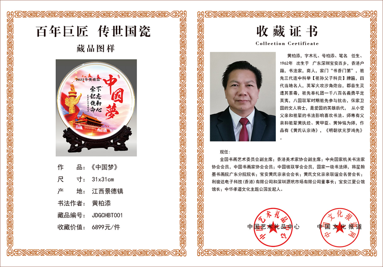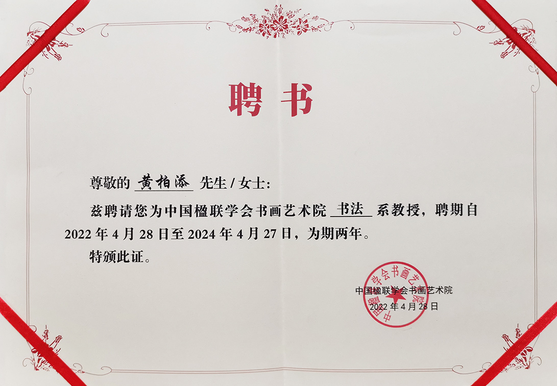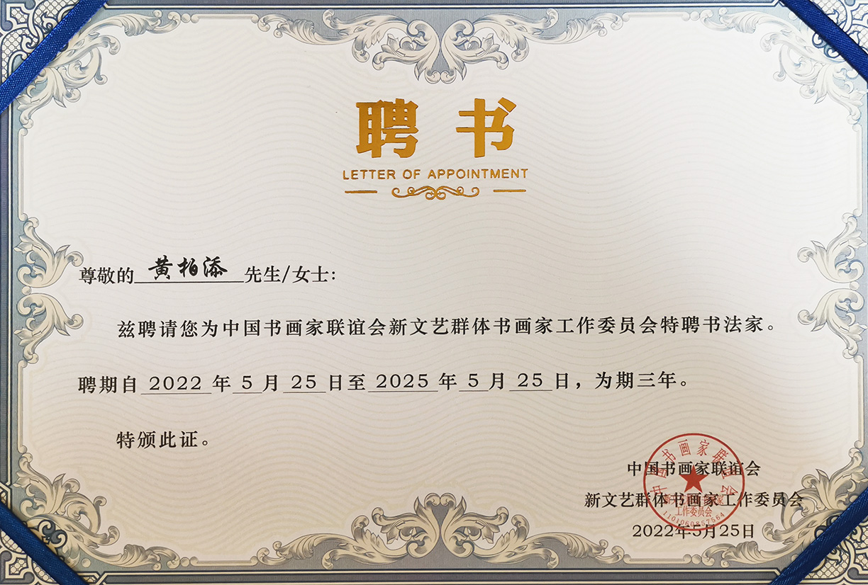 黄柏添,字木礼,号柏添,笔名任生,1962年出生于广东深圳宝安西乡,香港居民,书法家,商人,家门:书香门第“一门文脉、世代书香”,祖先三代连中科举【祖孙父子科贡】牌匾,四代当地名人,英军火攻沙角炮台,郡县生灵遭其荼毒,祖先奉札团一千八百名義勇平定英夷,八国联军时期祖先参与抗击,保家卫国的文人将士,是爱国的英雄后代。