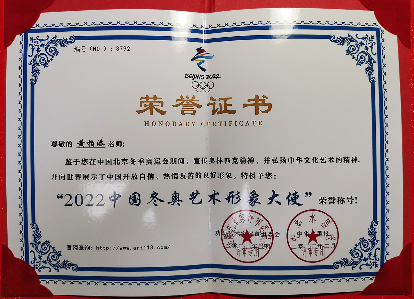 2021年12月为助力冬奥文化大型活动,走向世界的中国艺术家,特授予“奥运文化使者”之荣誉称号!