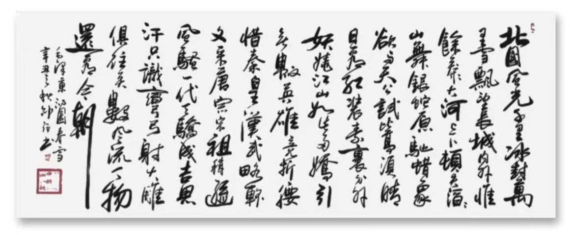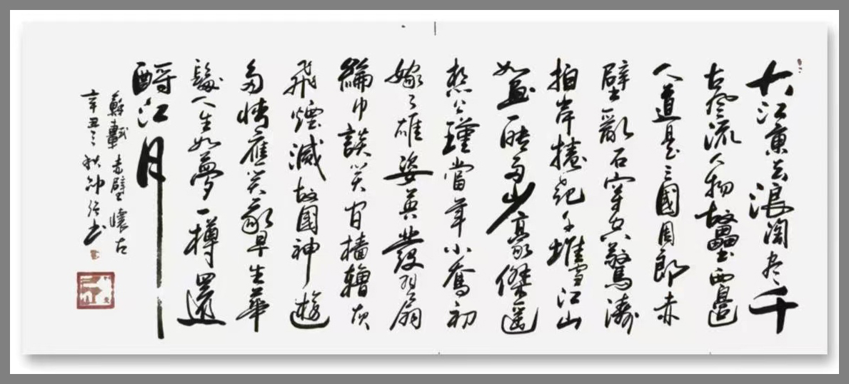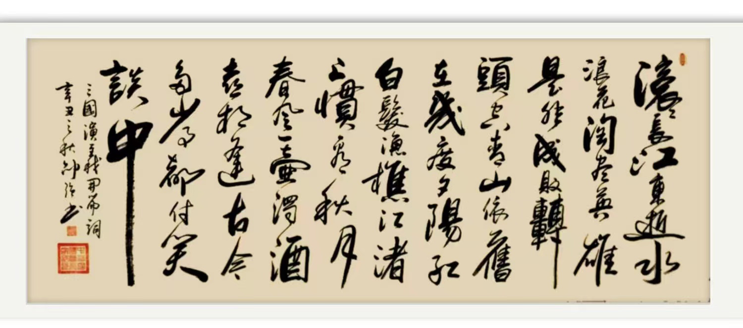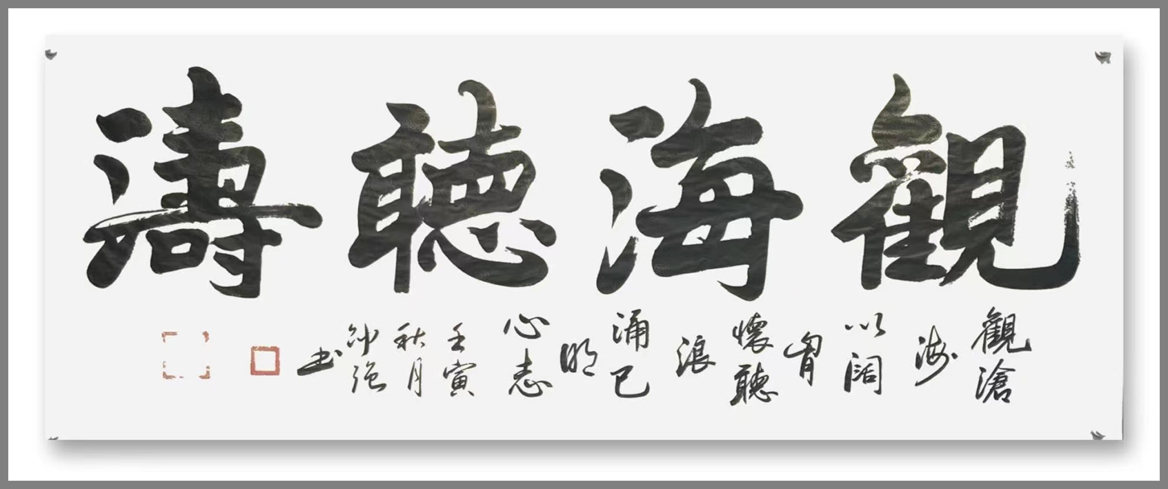 不积跬步无以至千里,不积小流无以成江海。所阅既多,所识既广,再重新反复遍临名帖,自然触类旁通,入了正题了。当邵强拜师时期,陈忠康先生为勉励邵强在学习的道路上继续锲而不舍,集腋成裘,为他题签“孤月亦能照山河”。而邵强老师的字号“孤月山人”也因此而来,老师刘炳森则评价其中的作品:“对传统碑帖用功颇深。隶书方拙用笔从《乙瑛碑》来,结字取《礼器碑》的秀逸,用笔方圆兼备,结体生动,字形略扁,多有隶书笔意。行书取法‘二王’,清新雅致,形神兼备,自然生动。草书则对怀素、黄庭坚心慕手追,追求笔断意连,纵横开合的气势,通幅于规矩法度中,随心所欲而不逾矩,流水行云,颇为精彩。从这些书法作品中能够感受到邵强是一个涉猎广泛、技法全面且风格明显的青年书家。”