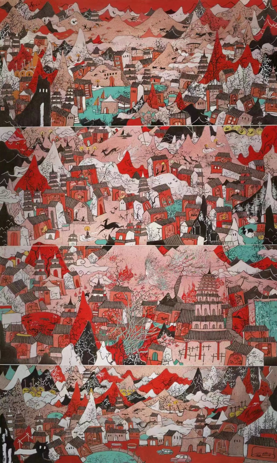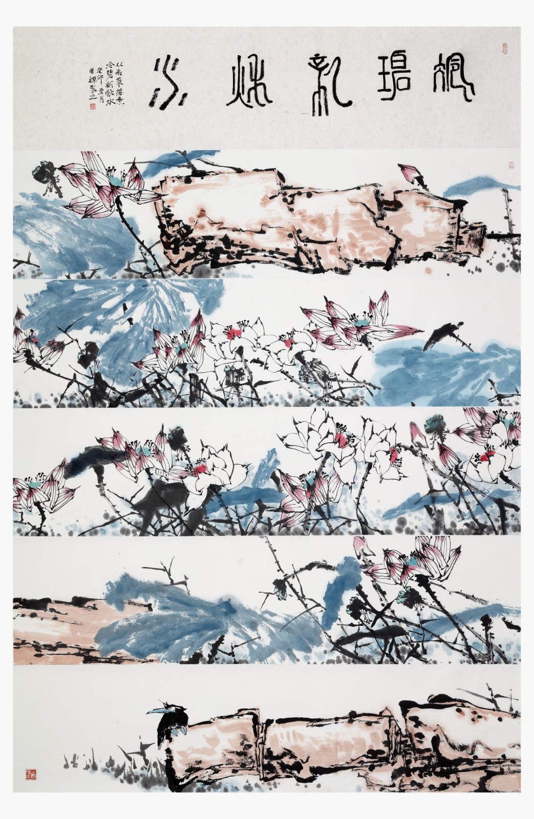 崔如琢先生喜欢数丈巨幅创作,秦荣辉作为一众弟子当中崔氏指墨技法唯一传承人,多次与恩师共同绘制,在业界名声鹊起,称其为崔氏指墨接班人。2019年入选“当代最具收藏价值和升值潜力的中国大写意画家”