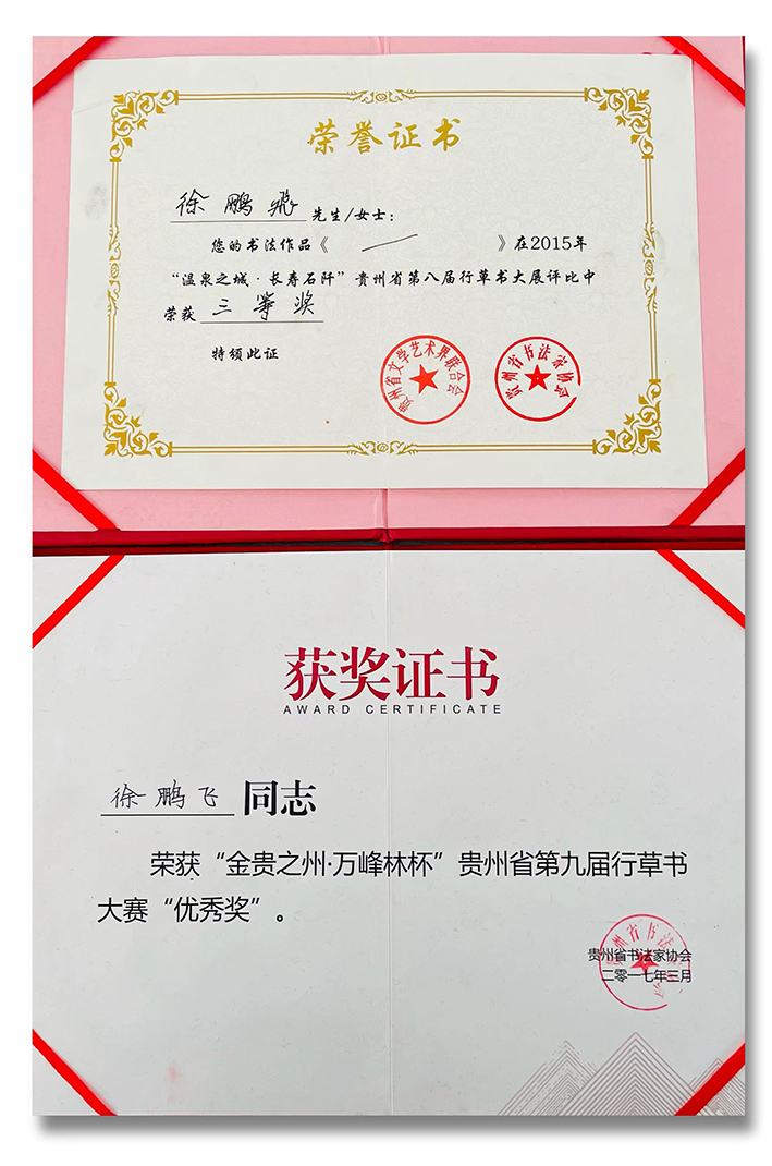 2021年中华书画名家评选大赛获:冠军金牌书画名家,作品曾被桂林市博物馆、贵州省美术馆、贵州省文史馆、贵州省图书馆等多家文博单位收藏。多篇学术文章发表于学术期刊。