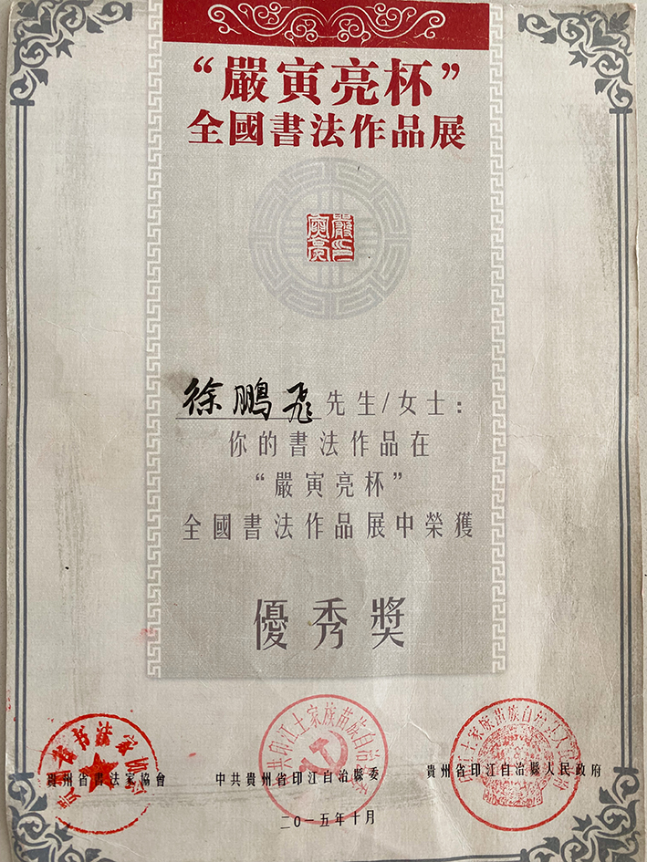 2015年参加全国“万峰林杯”第九届行草书大赛获优秀奖,