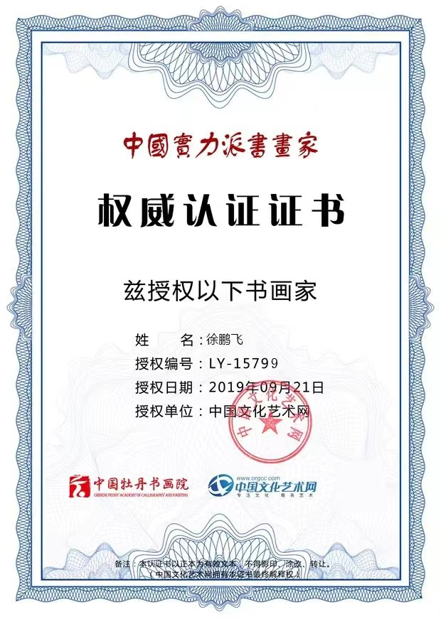 徐鹏飞从小深受父亲艺术文化熏陶,5岁习书,沉醉墨池,潜心学艺,研究中国传统书法技艺和书法理论。1996年拜陈忠康书法博导为师,主攻楷书颜真卿的《多宝塔》,行书主攻王羲之的《圣教序》;篆书主攻李斯的《峄山碑》,1997年在北京拜刘炳森老师为师,主攻隶书《曹全碑》、《石门颂》,《金农》,被刘炳森老师誉为为数不多的“天赋型学生“,但只有徐鹏飞老师自己知道,自己不是天赋型学生,一切成绩源于热爱和努力。在继承传统书法的同时,融会贯通、思索创新,始终以孜孜不倦、勤奋好学的致学态度,广泛吸取营养、博采众长,从而融碑帖之所长,集诸体之风范,去粗取精,形成自家风貌。其作品主要以行书和隶书为主,代表作《沁园春雪》、《临江仙》、《将进酒》、《陋室铭》、《誡子书》《室雅兰香》《禅茶一味》等。