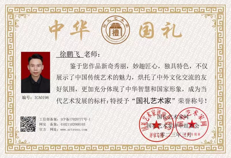 徐鹏飞,男,1985年生于贵州古城镇远,中国书法家协会会员,贵州省书协会员,浙江省书协会员,中国书画艺术家,国礼艺术家,一级书法师,三问斋书画院院长。从教近十余年,编写有《课堂笔记》《小学生同步练字帖》《行书隶书书法教程》,曾数十次荣获国家级,省级书法赛事奖项。