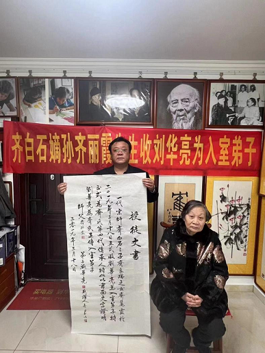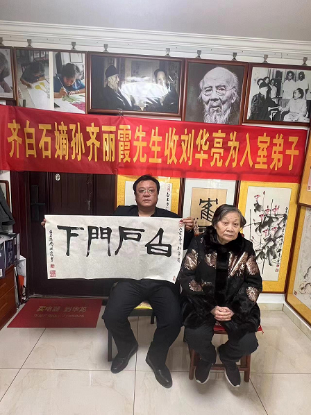刘华亮也是非常喜爱水墨虾,得到了齐派真传。由恩师齐丽霞亲自授教,他的水墨虾,不仅具有齐白石的艺术特色,更有一种生机勃勃的灵动,在传统技法上加以创新,形成了自已独有风格。就连齐丽霞先生都认为刘华亮老师是所有门生中,最有创作天赋的一位,也是最苛刻努力的一位。并亲自授予了“白石门下”印章、齐派传承“白石家法”印和白石老人亲手篆刻的肖像章印。