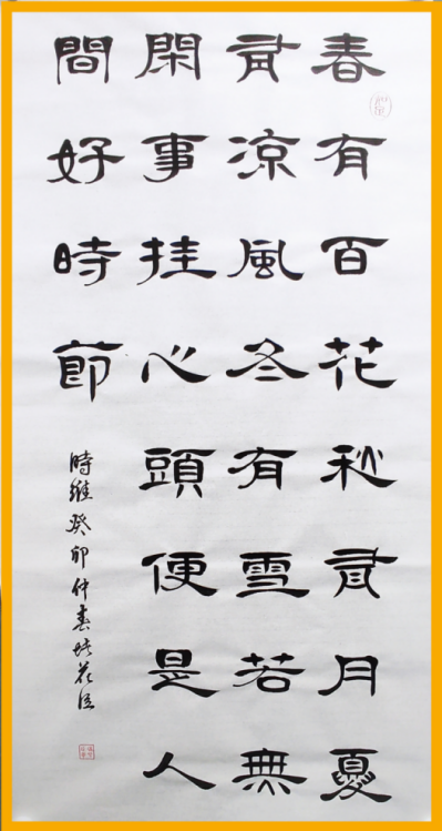 “书法学习,功夫在书外。活到老学到老,板凳要坐十年冷。如果说想在书法上取得长足的进步,不但要做好自己的学术研究,同时要持之以恒地去临习、创作,才能不断进步。”堵老师说。在2011年中国名家邀请展中入展并荣获金奖;同年被中国艺术品评估鉴定委员会评为每平方尺18000元;