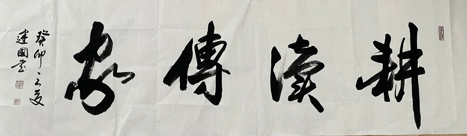 袁建国,幼承庭训,勤习书法不辍,研习众帖,多年来,坚持临习颜真卿、王羲之、孙过庭、文徵明、怀素等历代大家名帖,在注重吸收古代大师营养的同时,经常参观和参加国内外书法大展赛又从中学习其精华,书风从不求其索怪,而是放纵于自然而然之妙处,规规矩矩写字,本本份份做人。