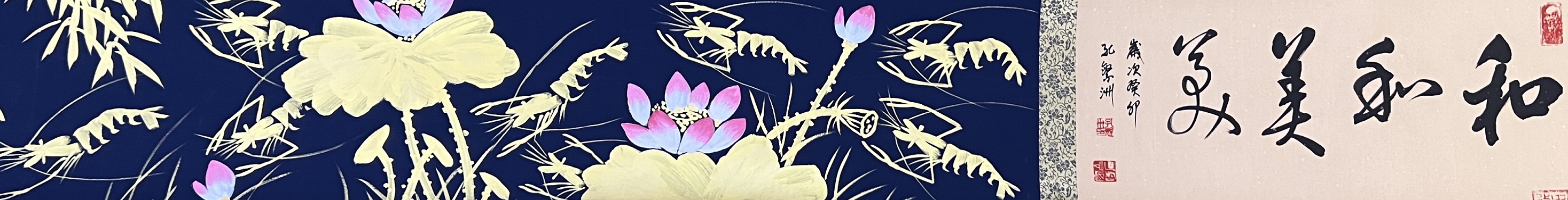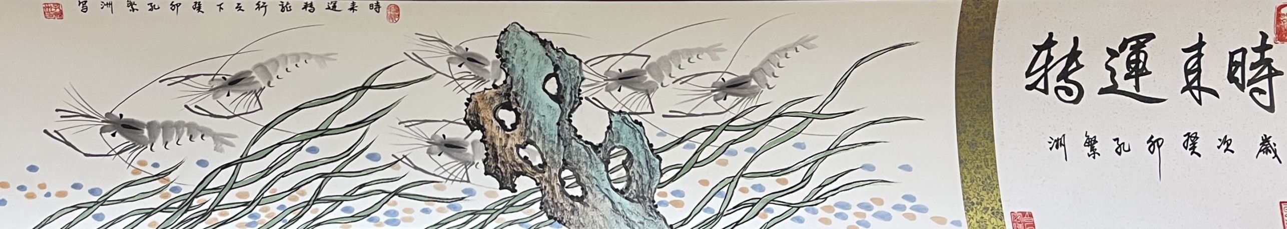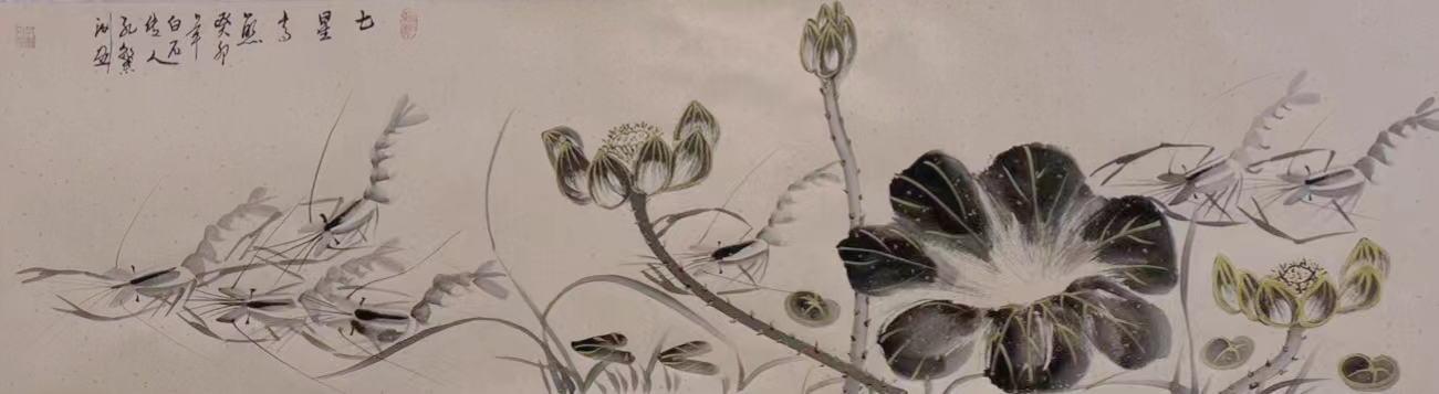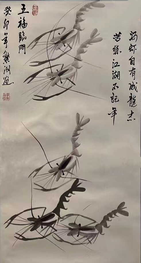 《和和美美-五米长卷》2000年与欧阳中石参加两岸艺术交流会入展作品;载入《世界当代华人艺术家史册》成为首位携金墨虾走出国门的艺术家。2020年业界估价600万起。