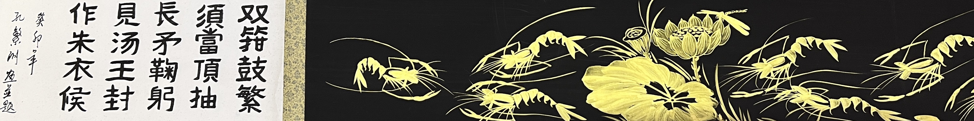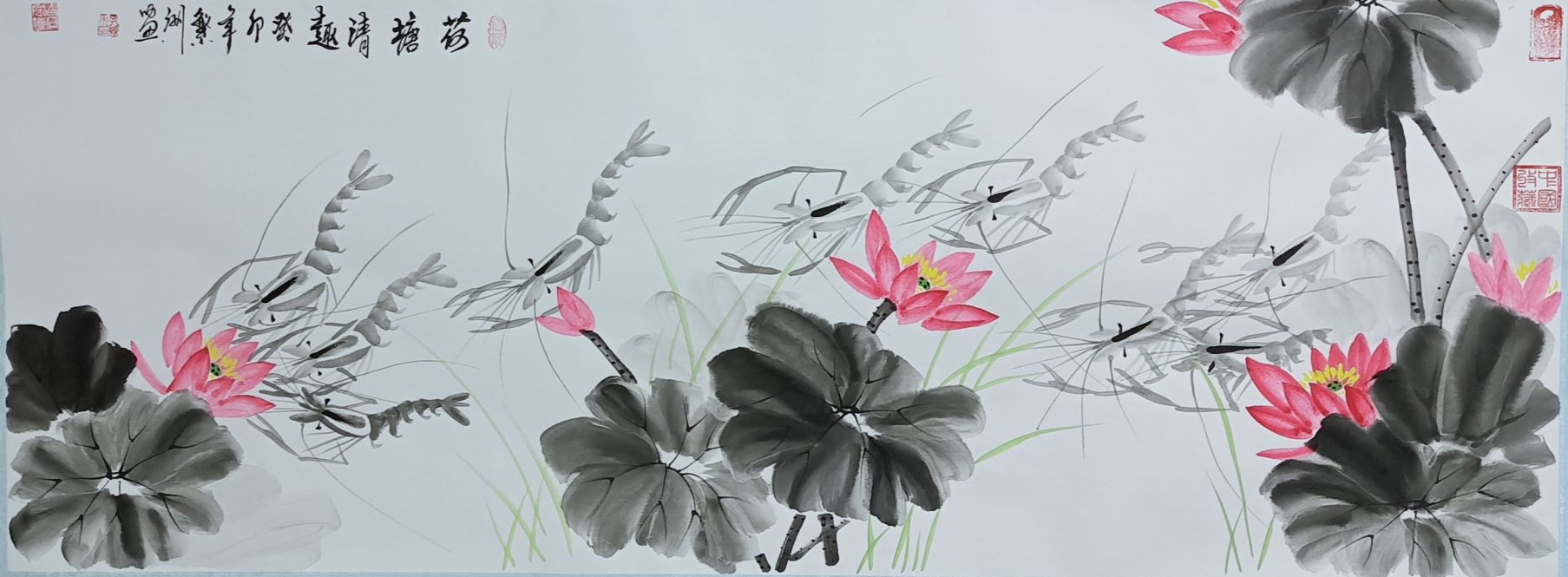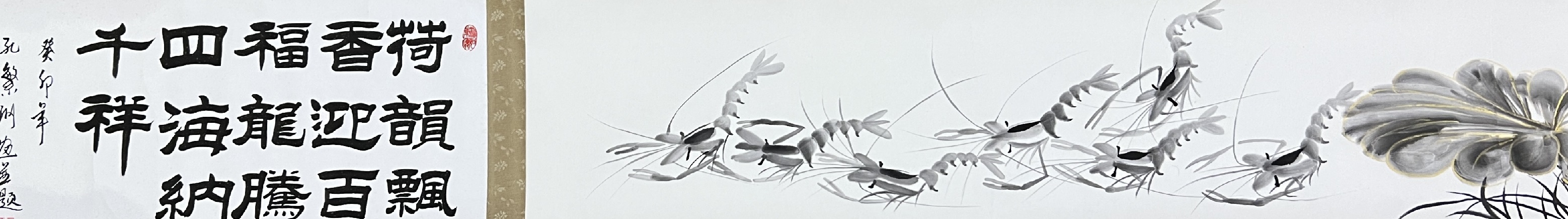 《和和美美-五米长卷》2000年与欧阳中石参加两岸艺术交流会入展作品;载入《世界当代华人艺术家史册》成为首位携金墨虾走出国门的艺术家。2020年业界估价600万起。