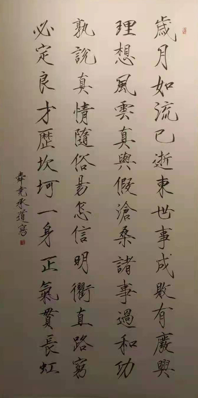 李承道,男,河南开封人,出生于千年古镇朱仙镇,受半城宋韵半城水的古都开封文化熏陶,痴于书画。少时以欧体开蒙,后学宋徽宗,兼学二王。画业初受张超群先生指导,后于大学时受西泠邓婕先生点拨,师法古人,始工山水,欲借宋元笔意而用于当代。作品曾入选新郑博物馆书画展、郑州书法教师交流展、郑州建党百年书画展等展览,并取得优异成绩。