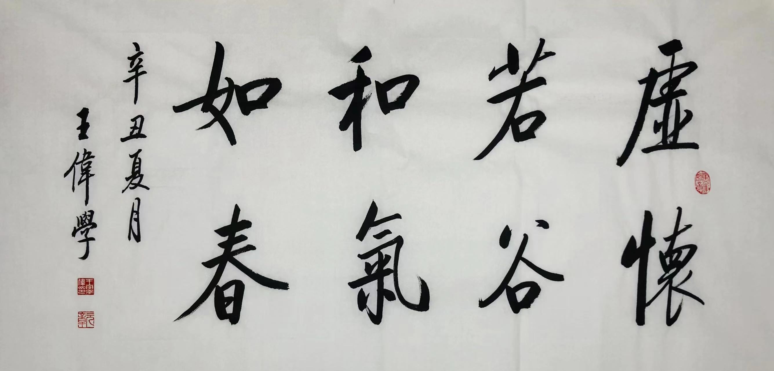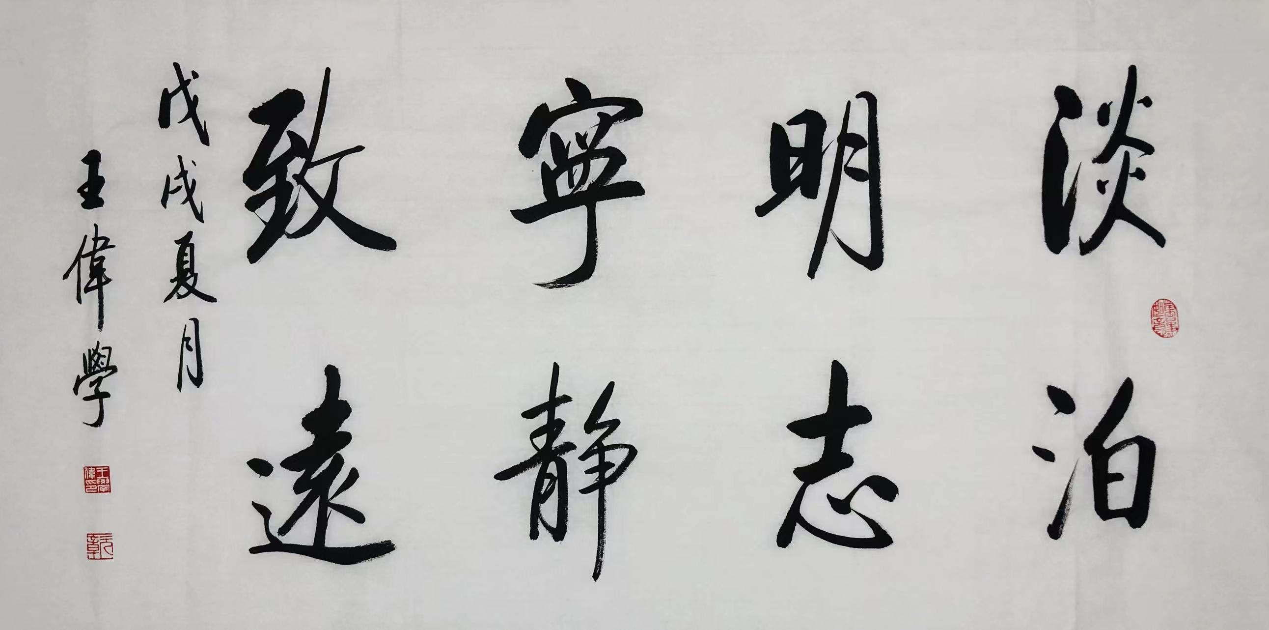 王伟学先生自幼酷爱书法,习二王书风,学米芾笔法,临池不辍,得各家之长,精心钻研,渐成一格,在结构和笔画上,外敛秀整而内钢铁骨,瘦劲挺拔,骨骼分明,气派大,撑得开;用笔简练、爽利,清健而不秀媚,瘦硬而不多露圭角,用笔上没有华丽的装饰性用笔,结字严谨,特别是楷书和行书形成了自己独特的书写风格,堪称当代一流高手。书界评其书法为“外柔内刚、自然洒脱、清隽儒雅”。其作品显示出深厚的功底与良好的人文素养,在业内具有很强大的影响力和超高的人气。