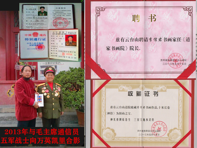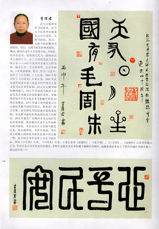 李信君:湖北武当一脉丹江人。中国现代著名书画篆刻艺术家,中国书画家协会副主席,国家一级书法师,国家一级美术师。北京军天书画院编委,中国道教协会道家书画院会员,武当下院太极书画院院长,兴安道家书画院院长,桂林中盟书画有限公司董事长、御印书画院院长。