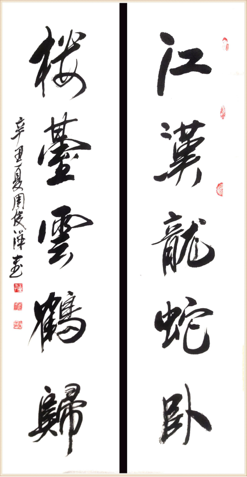 周俊洋儿时染指,一发不可收,唯于诗书画印潜心研讨,力图造极,并以此为乐事。在绘画艺术上,他崇尚徐渭、八大山人以及吴昌硕的画风,所作国画,注重传神,意境旷达;书法求篆于金,神游三代,其作品苍劲老辣,气势雄浑; 篆刻直追秦汉,兼取明清诸家之长,所治之印,风神流动,气象万千。而立之后,他视黑白虚实为无边天宇,随缘驰骋,一抒人生。