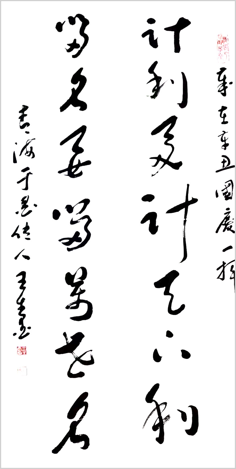 书法作品在省市及全国参展,并多次荣获金、银、铜奖等殊荣,特邀书法作品在台湾、新加坡、加拿大、日本等国和地区参展井被文化机构及收藏机构收藏,特等奖作品被河北野山坡国家地质公园和奥运石刻碑林永久展览保存,并授予绝妙书画家荣誉称号,石刻标准草书千字文问世。