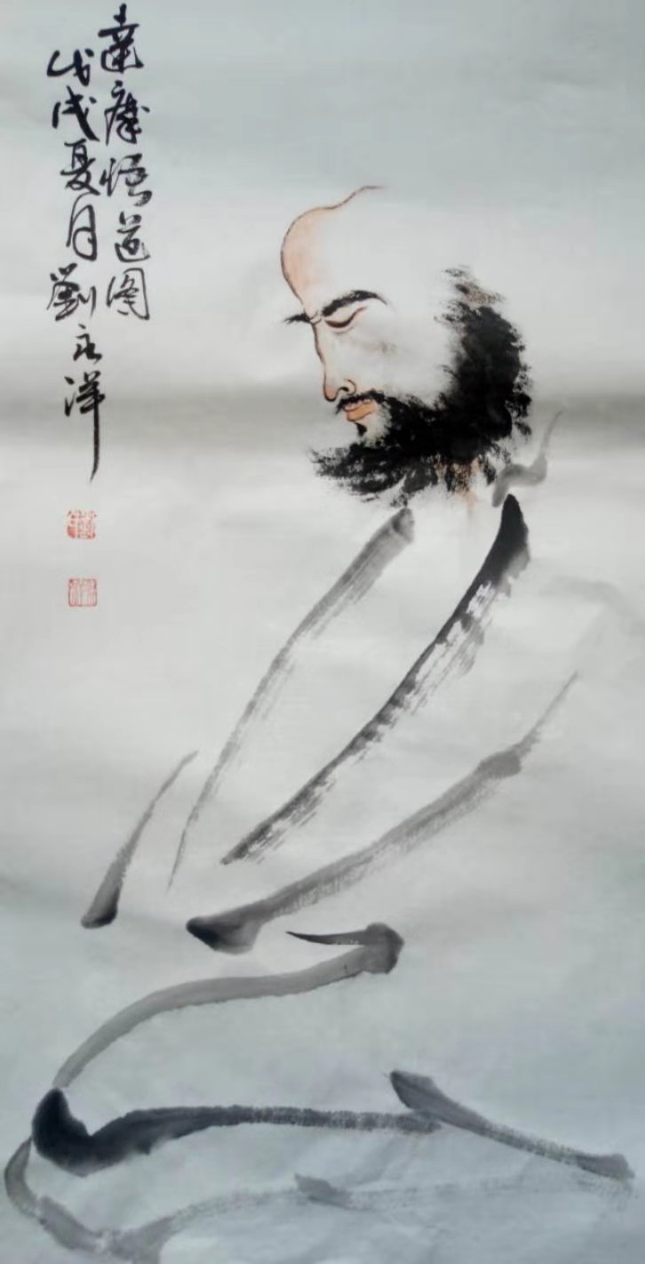 他笔下的达摩犹如他对绘画的参悟,笔法粗壮,画风奇特,其脑、其须、其神、其衫皆独有创意。他认为人物画最大的境界就是把自己画在其中。为了把握神韵,不但在寺庙佛像前如老僧如定,更是把留了多年的长发剃光、胸前也挂上佛珠,感受佛陀的法相。