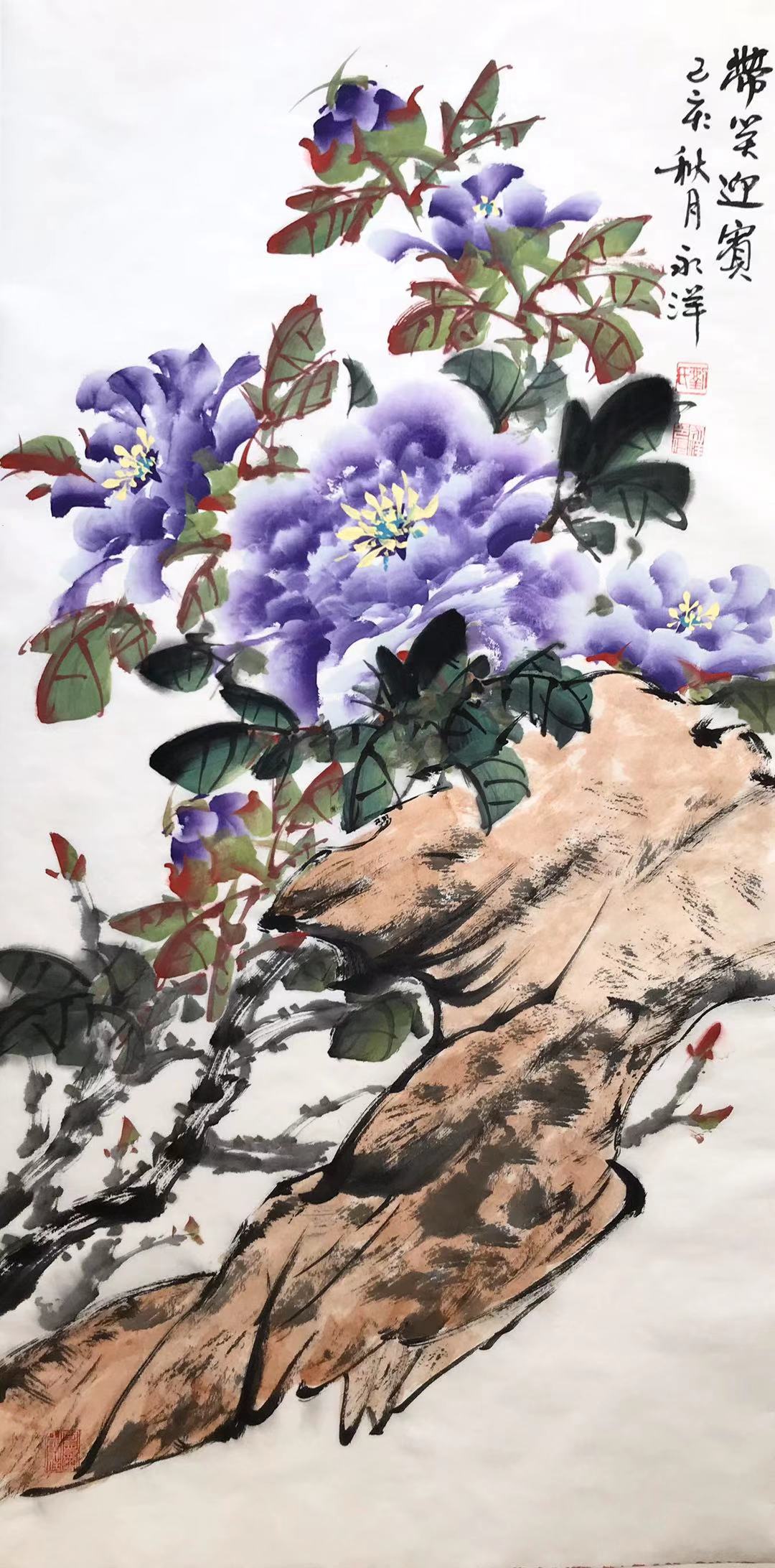 他亦爱牡丹,其画风写意,构图别致,俏枝勃勃生机,叶色过渡自然,叶筋线条勾勒细腻,古拙苍劲,精细之处刻画入微,虚实相间巧拙互用,展示了他不屈服于命运,富贵不狂、艳丽不俗的无穷魅力。