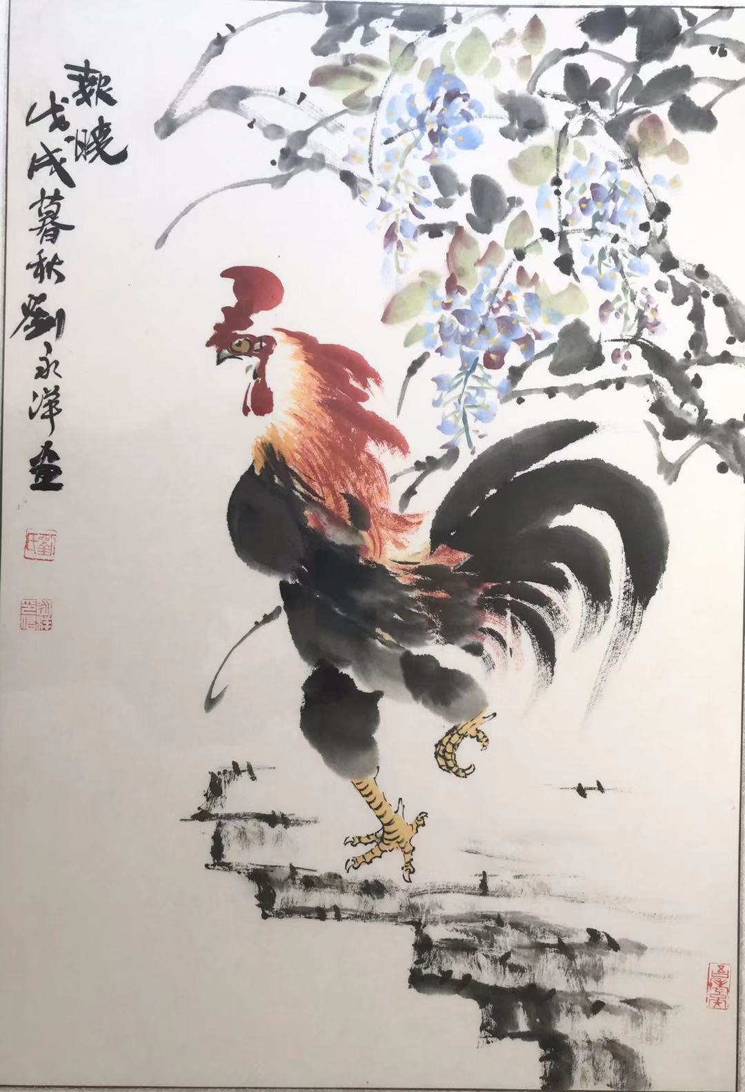 他独爱雄鸡,更以“五德之禽”敬之,他笔下的大公鸡有傲气、霸气,更有柔情、亲情。他为了画活公鸡,在家中每年都有散养,观其动、阅其静、听其鸣,从生到死,皆有所悟。