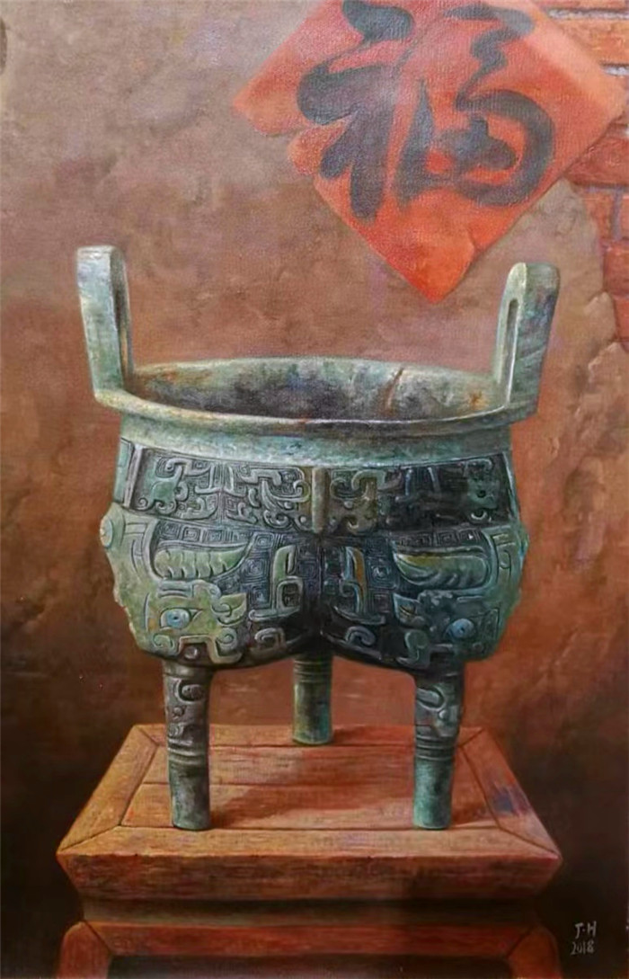 2019年8月油画《百财图》,紫砂壶《八方周盘》被曼城艺术中心收藏。