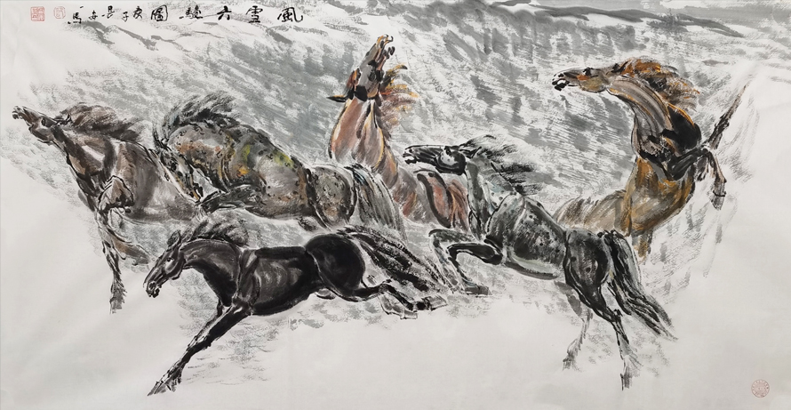 邵西安先生的山水、马俱佳,他画的长安派马已达到很高的造诣和境界,多年来他勤奋不辍,向宗师、大师学习,结合自己的特点吸取精髓完善,成就了长安马派画风。习古而不泥古,揣摩其精髓之所在,从不满足,纵观邵老师的马画作品,论笔墨皆精致刚毅恢弘大气,富有生命力和时代感,能感受到他对艺术创作的热爱,更能感受到他创作精力的旺盛,邵老师在画马艺术中笔墨运用刚毅流畅不拘一格,然却笔笔遵循宗师徐悲鸿先生用笔用墨之精髓,以实为之,无描摹之状,有徐悲鸿宗师奔放流畅,又有张义潜大师的沉稳涩苍,更有自己长安派的浑厚大气,所墨之处恰到好处。