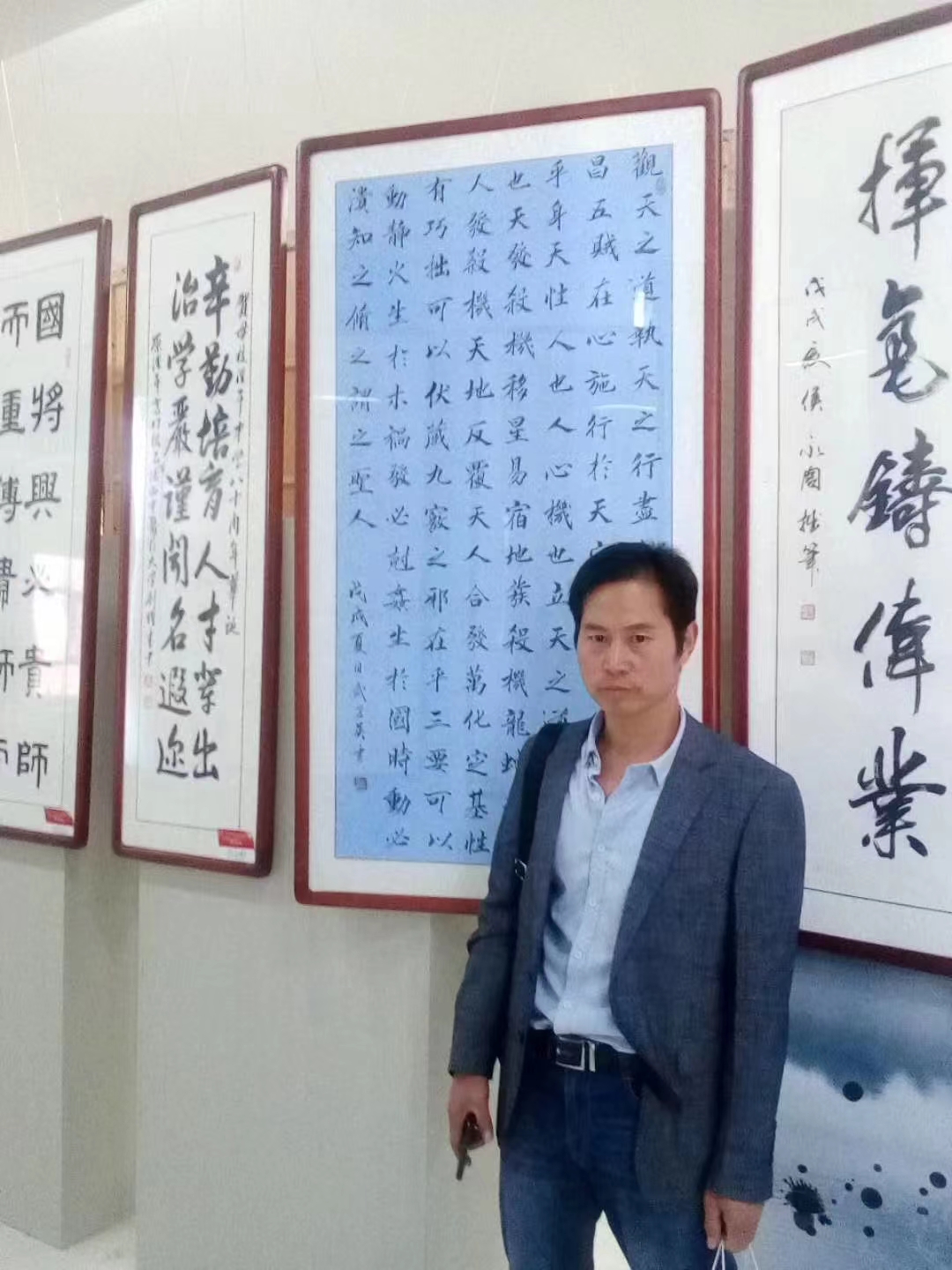 武世英,男,1971年11月出生,自幼喜爱书法绘画,早年曾师从中华鹰王段诚金先生学习绘画,后又研习书法,以颜柳入手,不断练习,遂临习王羲之《圣教序》、赵孟頫《洛神赋》等名家字帖,他的书法用笔根清源正,方圆相辅为美,线条流畅为尚,如古琴铮音,有很强的艺术穿透力。书法收获大造诣,必修行书草书。其行书追及二王,精修《兰亭序》《中秋帖》,把王羲之、王献之书意自由,以致行书飘逸,笔功墨韵皆属上乘。章法讲究,古劲浑厚,能于疏落中见紧凑,闲静遒丽,頗有韵致。同时书法水平也在笔耕不辍的学习中取得了很大的成绩,作品也多次在全国书法大展上荣获殊荣。其代表作品有《兰亭集序》 、《沁园春 雪》 、《陋室铭》等等。
