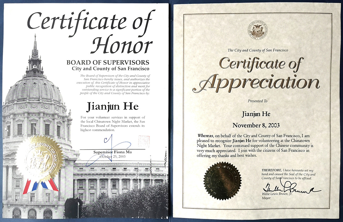 旧金山市市长布朗和监督委员会主管菲奥娜·马为旅美画家何建军颁发的证书