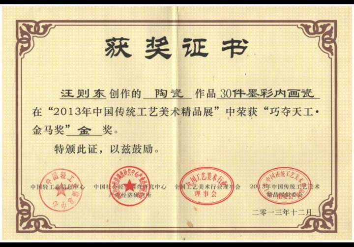 2013年中国传统工艺美术精品展中“陶瓷内画溪山烟云” 荣获“巧夺天工”金马奖(金)奖。