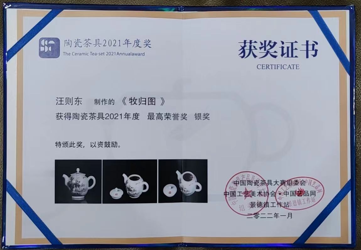 陶瓷墨彩壶(牧归图)在2021年度“陶瓷茶具最高荣誉奖”作品荣获 银 奖,作品曾刊登在,江西日报、江西商报人物封面、景德镇日报、瓷都晚报、新闻信息报、创业周报、以及江西卫视,江西二套(地宝当家)栏目,景德镇电视台一、二,三套媒体报道等。