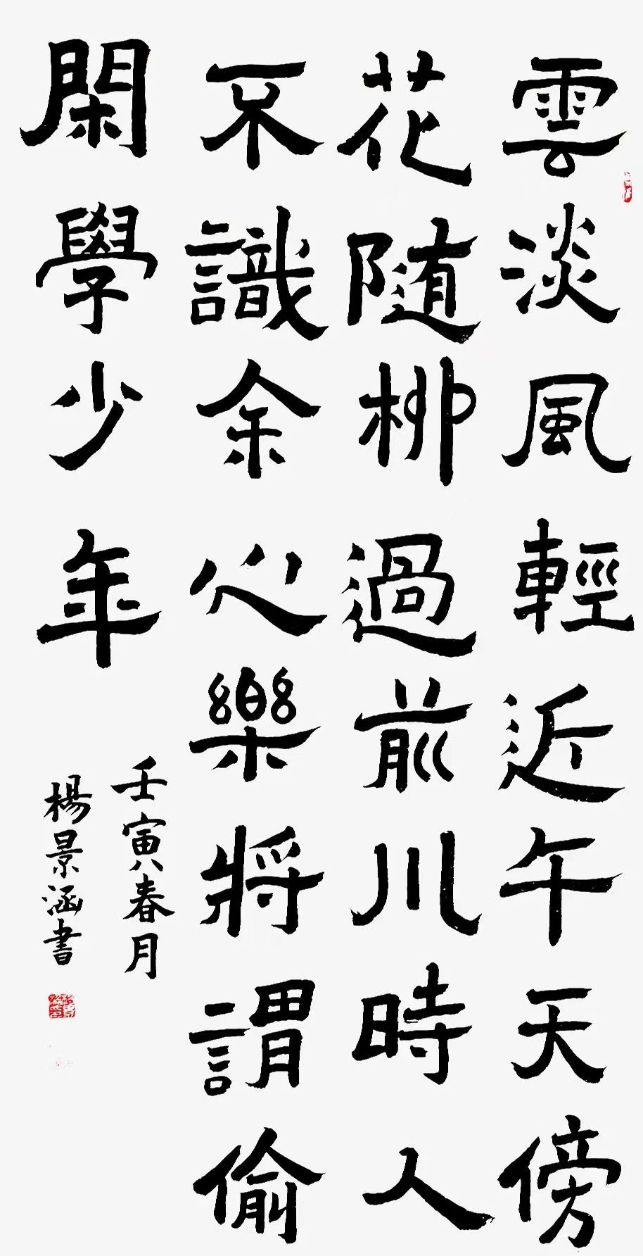 杨景涵,男,陕西西安,长安区,2009年生,现就读初中,我是一个喜欢爱好书法,国画的阳光男孩,6岁开始学习书法