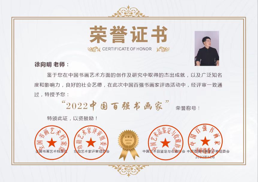 热烈祝贺:由全国书画艺术档案馆、功勋艺术家评审组委会、中国艺术品鉴定与收藏协会、中国百强书画家评审组委会联合举办“中国百强书画家”评选活动,著名书画家徐向明——荣登2022中国百强书画家榜单。