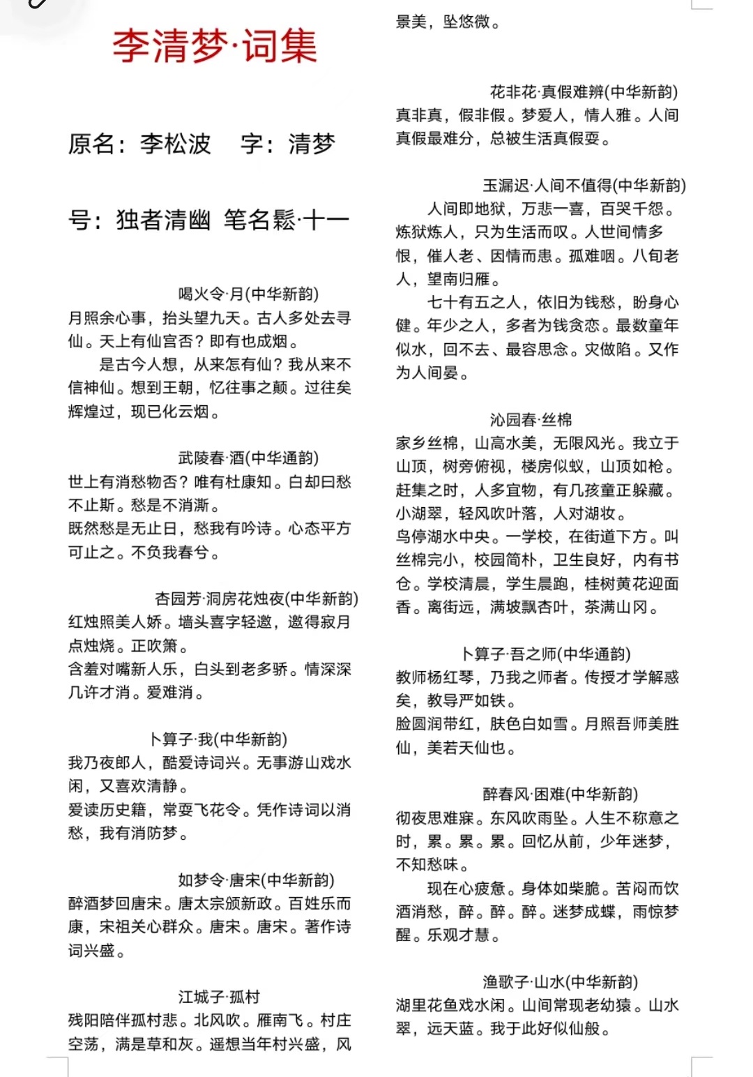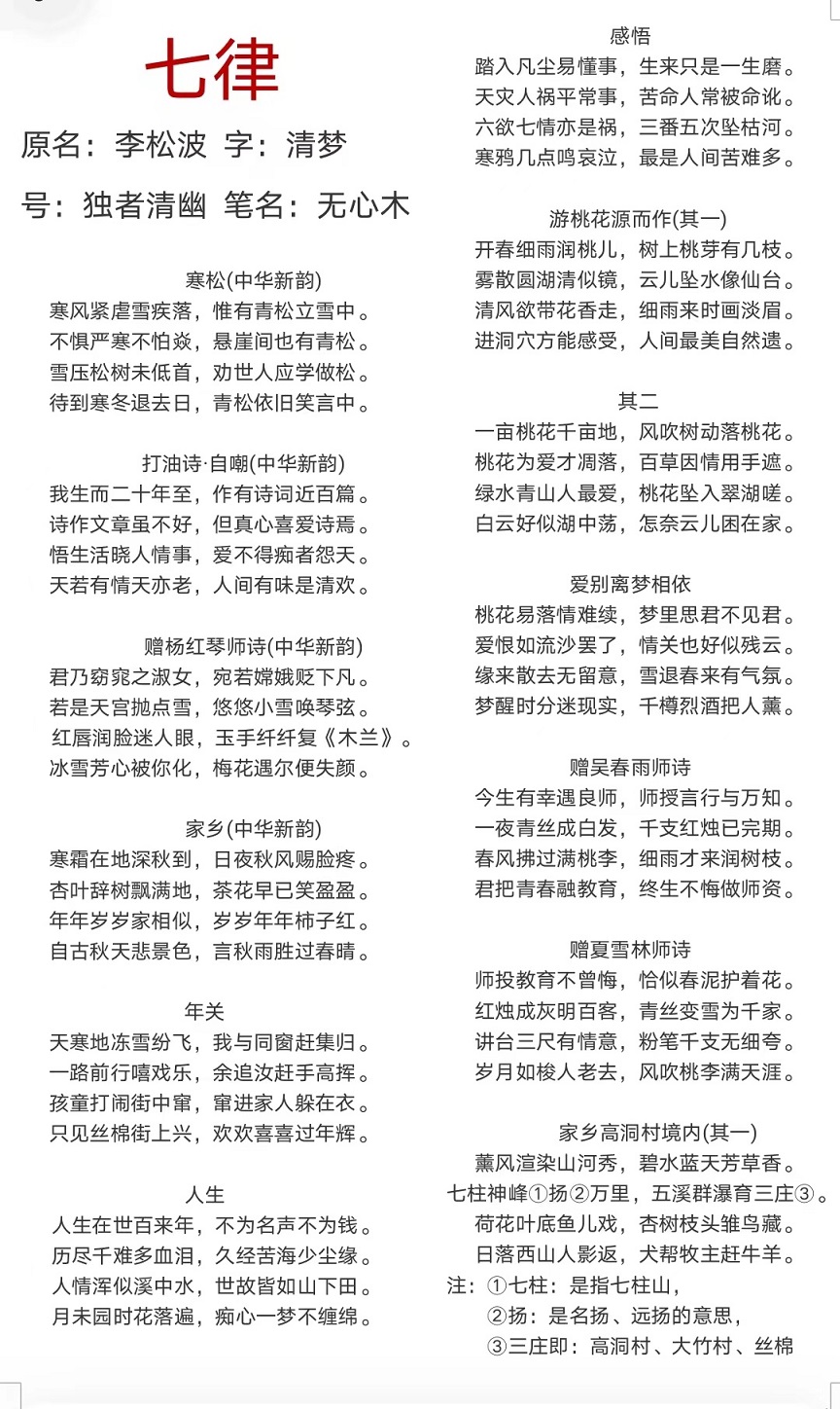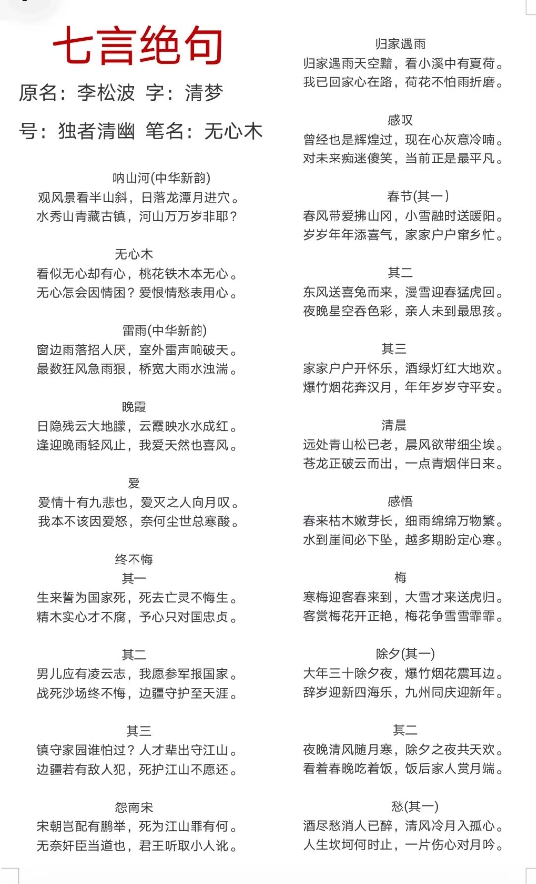 李松波,男,生于2004年,字清梦,号独者清幽,笔名:无心木,贵州遵义务川人氏,目前就读于遵义某校,中国共青团团员。中华诗词学会会员、贵州省诗词楹联学会会员、黔雅诗社会员、务川县诗词楹联学会会员,青年文学家兰心分社文学部部长。获“春天诗会”全国征稿大赛金奖,参与编辑《唐人七绝精粹》、《唐名家五律全集》等,作品入选《当代诗人一千家》等。闲时喜欢游山玩水,喜读历史书籍,不过更偏爱诗词,以诗词为友,诗书为诗!