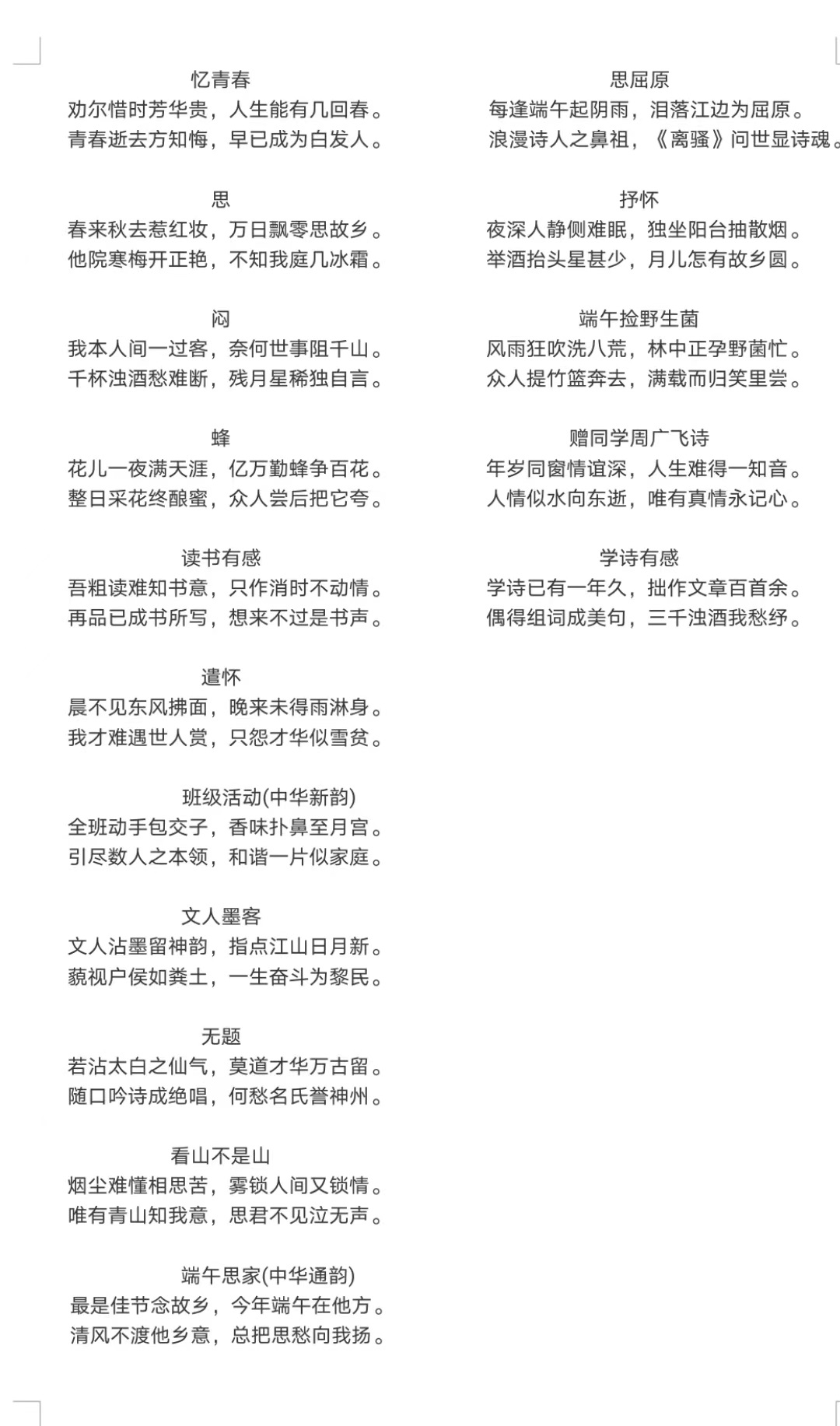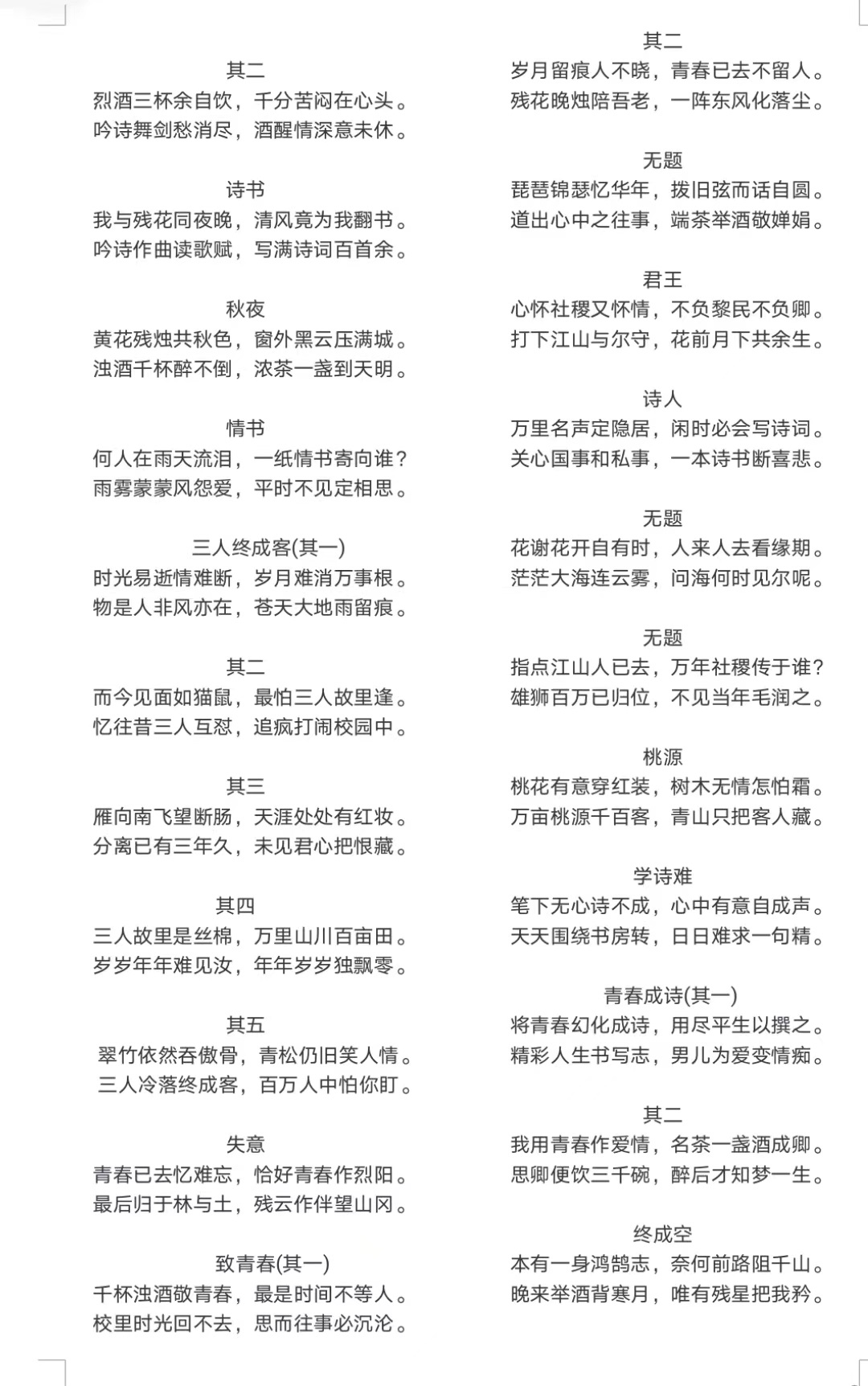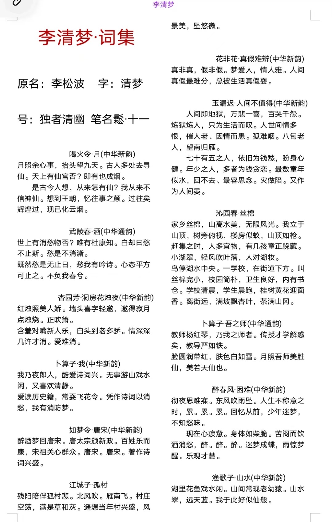 李松波,男,生于2004年,字清梦,号独者清幽,笔名:无心木,贵州遵义务川人氏,目前就读于遵义某校,中国共青团团员。中华诗词学会会员、贵州省诗词楹联学会会员、黔雅诗社会员、务川县诗词楹联学会会员,青年文学家兰心分社文学部部长。获“春天诗会”全国征稿大赛金奖,参与编辑《唐人七绝精粹》、《唐名家五律全集》等,作品入选《当代诗人一千家》等。闲时喜欢游山玩水,喜读历史书籍,不过更偏爱诗词,以诗词为友,诗书为诗!