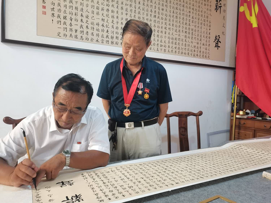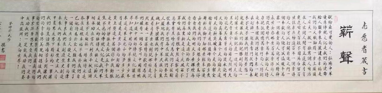 任合庄,1956年出生于河南省武陟县嘉应观镇人,他13岁始学隶书,毕业于中华硬笔书法函授中心,荣登中国书友通讯录,国际书法家(国内卷)通讯录,89年获河南、北京华艺习字会会员,黑龙江、内蒙古等多省市书协会员理事,93年受俄罗斯国特邀研讨,96年文化部,****高研会特邀代表,兼修软笔,2020年参加现代名家“美艺杯”获三等奖,2021年获“百家争鸣杯”三等奖,作品在厦门,上海等地参展。任合庄老师不仅是武陟书法届的名人,还是一位将书法视为传承红色基因,正能量的工具,免费为对参战老兵赵永富,曾经受过习近平主席接见过的焦作市艺新街道办事好妈妈张冬香工作站赠送了他书写装裱过的“薪声”长卷,从小时刻以雷锋为榜样,1975年,曾因为一素不相识的县人民医院抢救病人输血600毫升,被团县委誉为巜新长征突击手》,年近七旬仍将自己原创励言《薪声》作品,书法近十副展示义赠社会各界,被人们称颂,并带领8岁孙女到处演讲分享,弘正能,扬新风,学雷锋,倾传承!2019年5月历时月余书写“道德经”长卷6000余字20米长赠送内蒙古自治区包头市红格尔部落促进民族团结。2020年3月至2022年12月疫情防控期间,书写文化作品1000余副赠送给疫情防控单位,一线防疫人员,志愿者及驻武部队,用文化鼓舞大家战胜疫情。2021年6月至2023年3月书写志愿者箴言《薪声》数百幅,自费装裱赠送给市委党校,河南省电视台播报河南节目组,红十字会等多家单位,致力于弘扬传统文化,得到了内蒙古医学院教授,副部级领导哈斯阿根的高度评价。