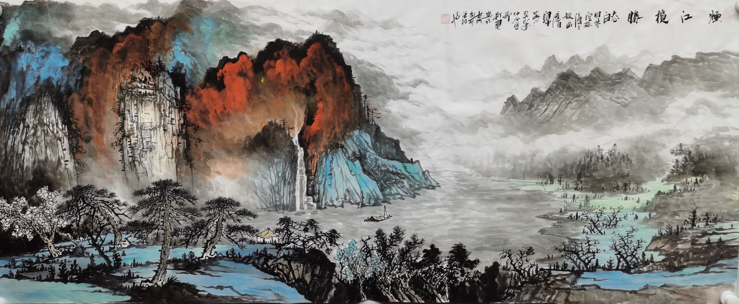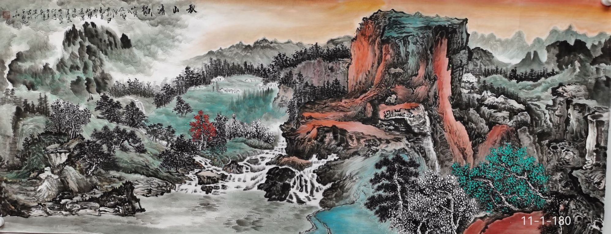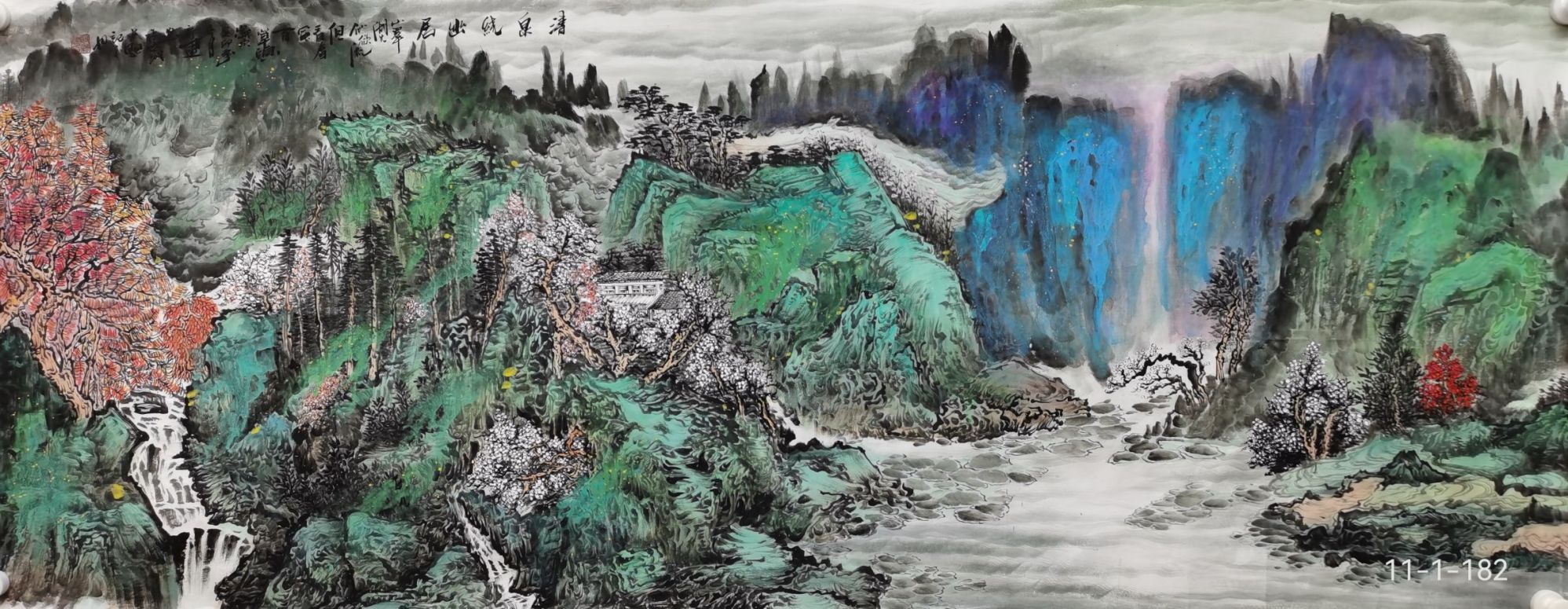 殷新建的重彩山水,在继承传统晋唐大青绿山水的基础上,吸收了壁画、岩彩、唐卡等艺术形式和技法,大胆创新。近年来,以表现