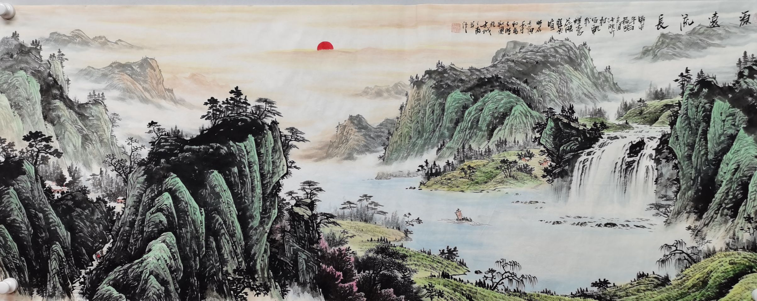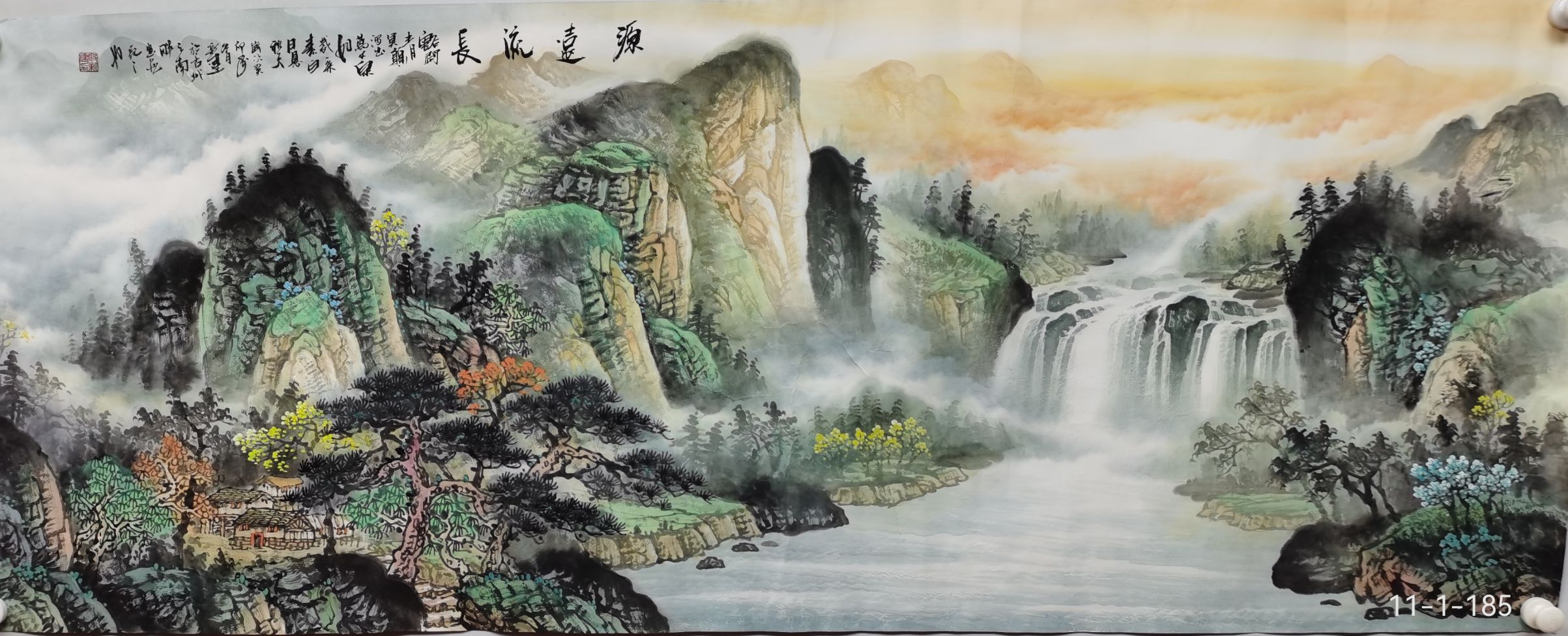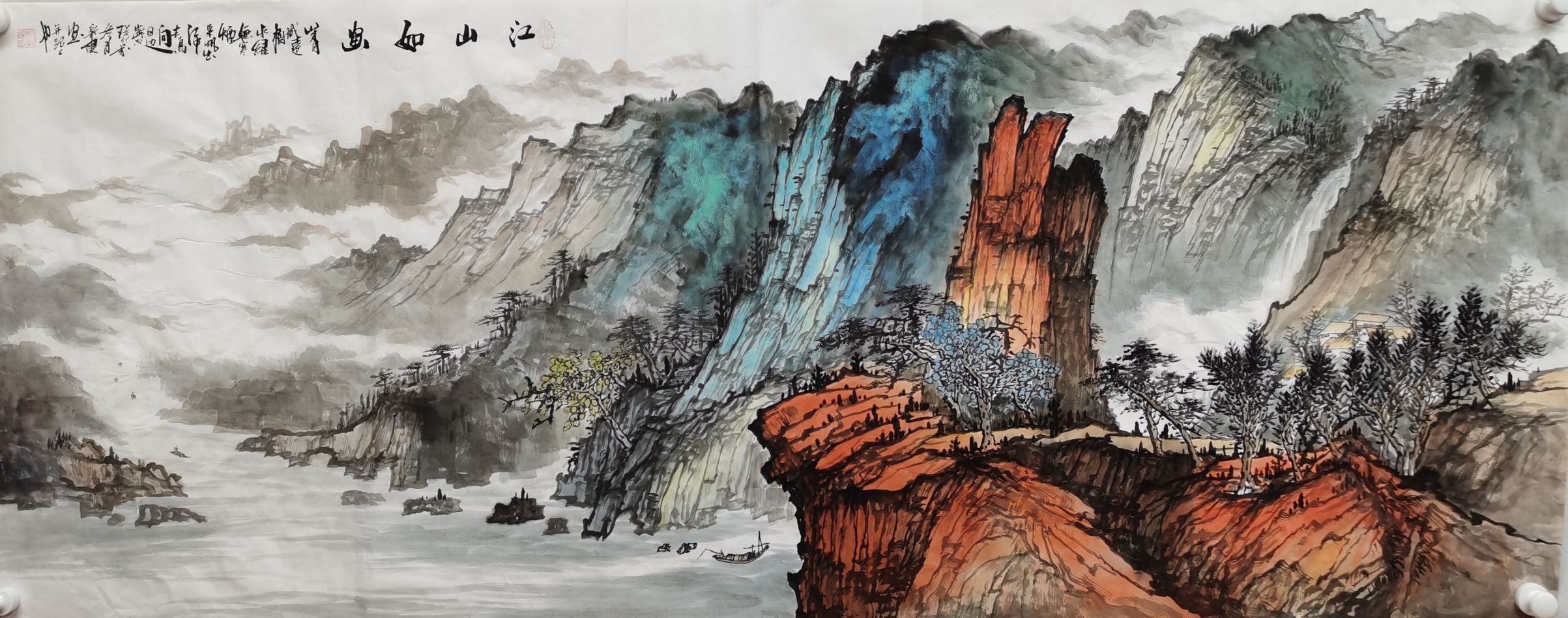 殷新建的重彩山水,在继承传统晋唐大青绿山水的基础上,吸收了壁画、岩彩、唐卡等艺术形式和技法,大胆创新。近年来,以表现