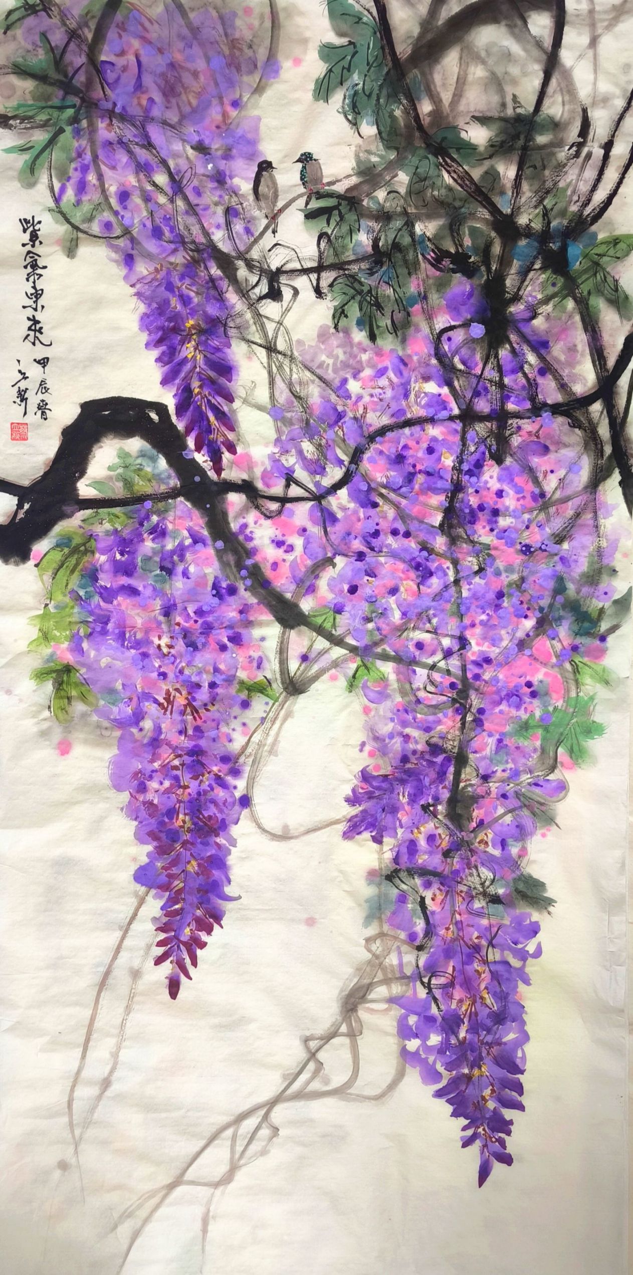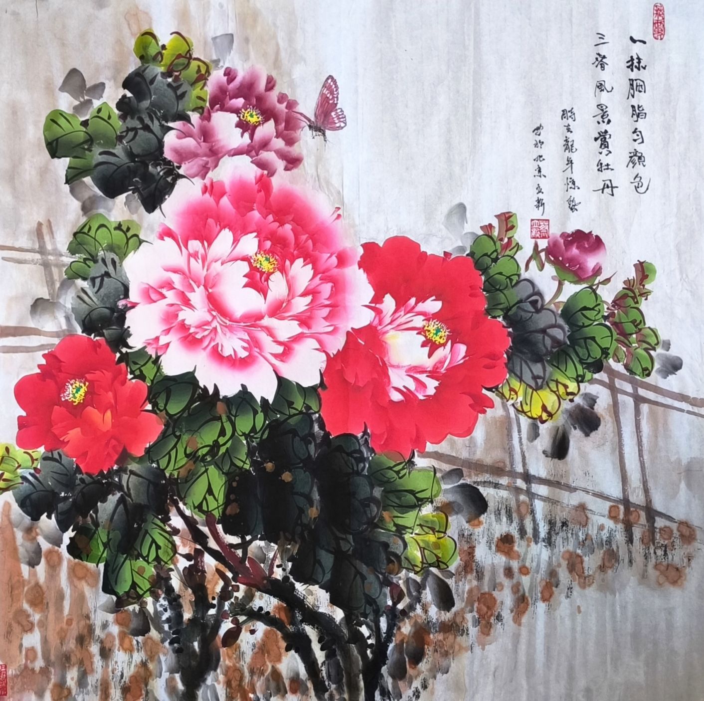 在花鸟的写意创作中,蔡立新先生往往会采用水墨色相互交融的状态,并通过适度勾染、晕积来实现写意形态。题材方面,亦是兼有牡丹、紫藤等传统的文人画题材,就以一幅牡丹画作来说,画中牡丹取象是建立在了随机生发的写意基础上,从而恰到好处地展现出了牡丹原有的雍容之姿和华贵气象,墨色的晕染更是有增添了氤氲情趣,着色象其形采,渲染得其神气,此真是清雅而不失于灵性,柔润而不失于内秀,花卉绽放气息祥和,缘枝坠叶姿态横生,所谓牡丹花品冠群芳,况是期间更有王,想来便也正是蔡立新先生所追求的境界。