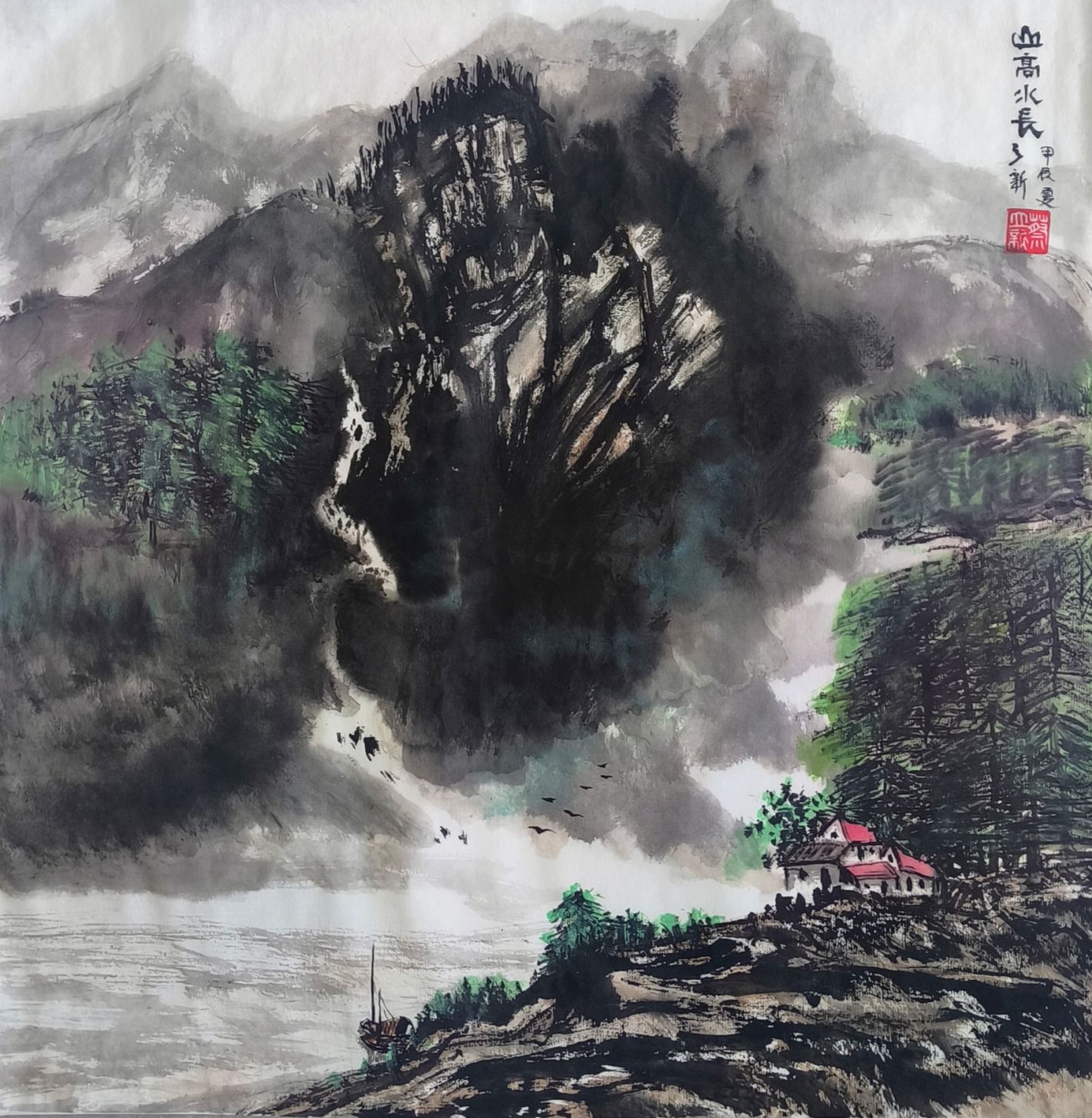 山水画境,更有身临其境之感。但见蔡立新先生那满纸云烟,或春山淡冶而如笑,或夏山苍翠而欲滴,青山林木生机葱郁,岩扃泉石豫在目前,笔以立其形质,墨以分其阴阳,山水悉从笔墨而成也!在皴法变化中营构罗峰列嶂,在墨色融汇中彰显水云聚散,既能见峰嶂疏密中的曲径通幽,也能识云烟蒙味中的烟岚景象,画中蕴情,驰目骋怀,观之无不能令人深感其画意之旷远,造境之奇逸!由此若论大家山水,像蔡立新先生之作则必然是当之无愧!