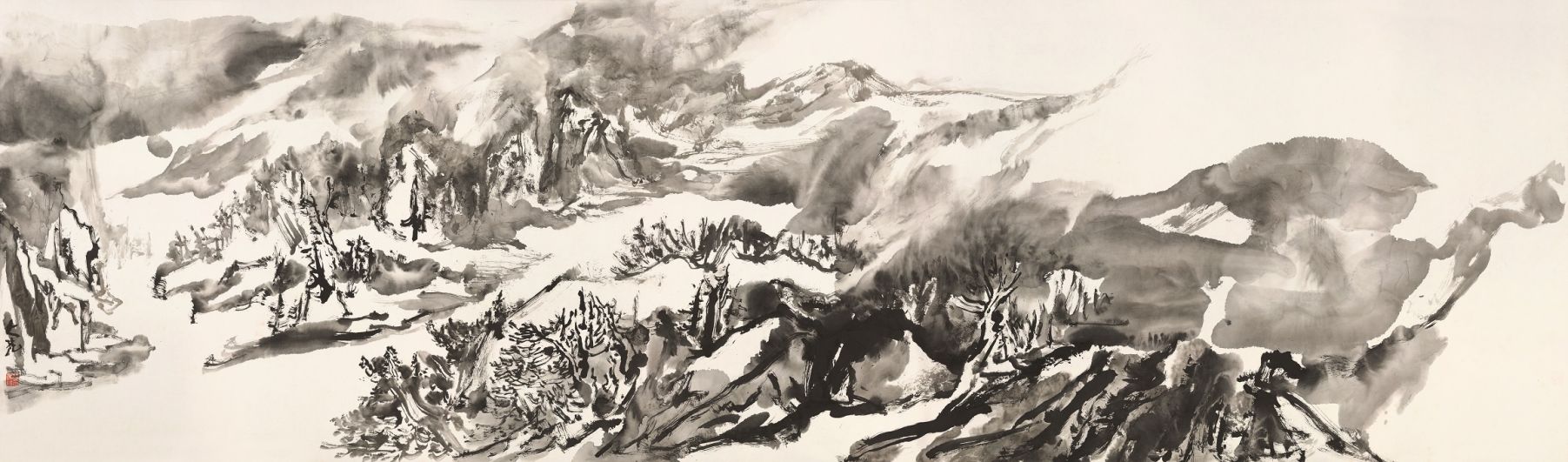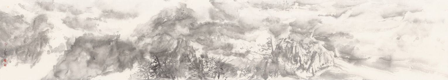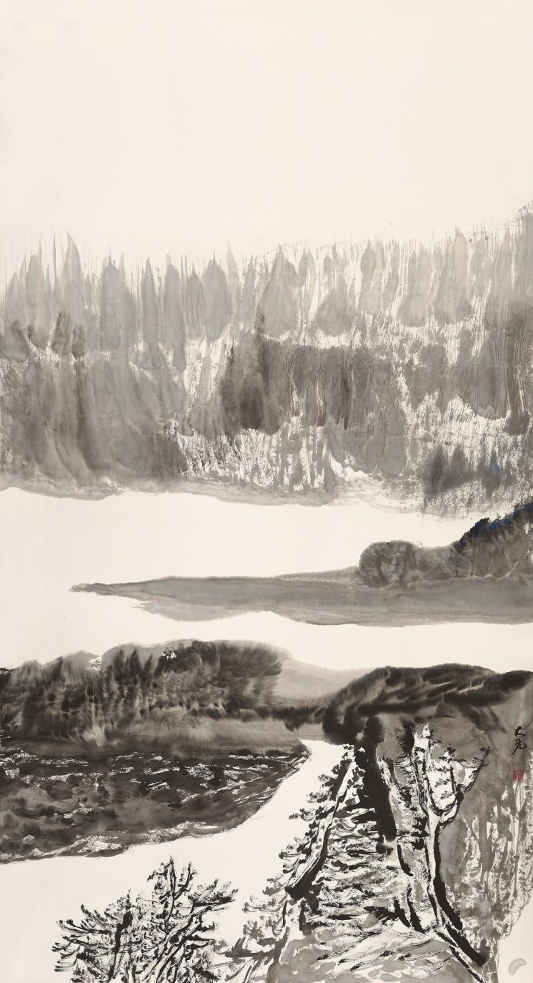 一一以水墨山水画角度切入创作,以大川大山为主题表现对象,用纯明的水墨语言、豁达的挥洒手法、巧妙的空间秩序,渲染出画面的“势与空间感”、“色与空气感”、“光与呼吸感”,这是一种放,也如一种空,意犹未尽,欲言又止……