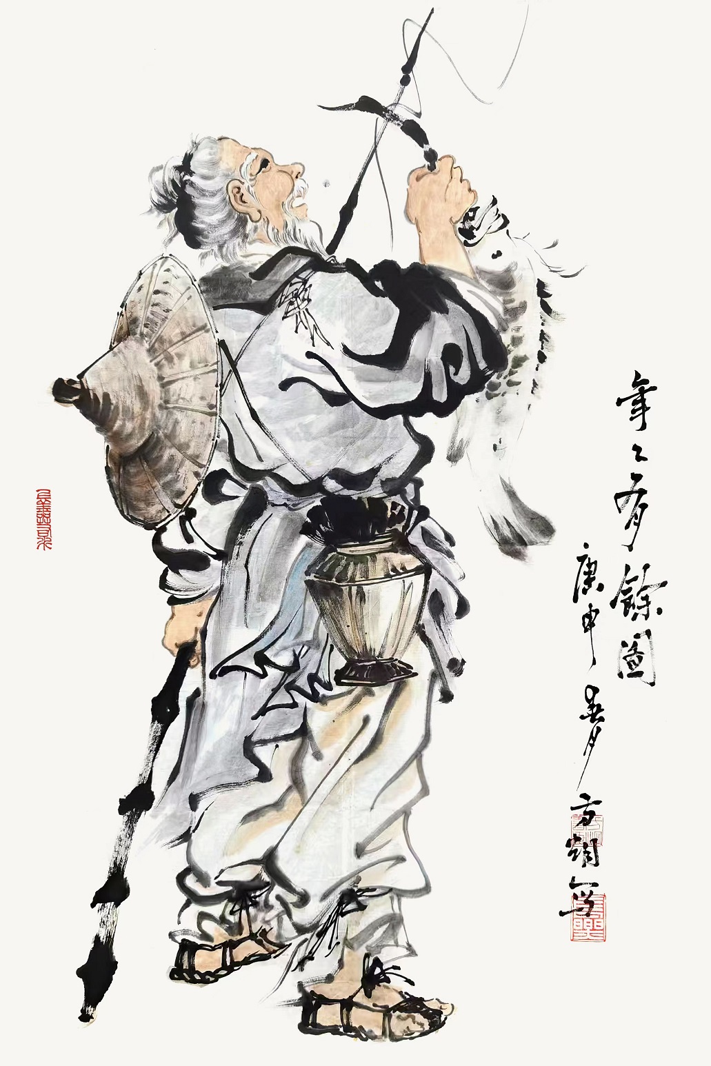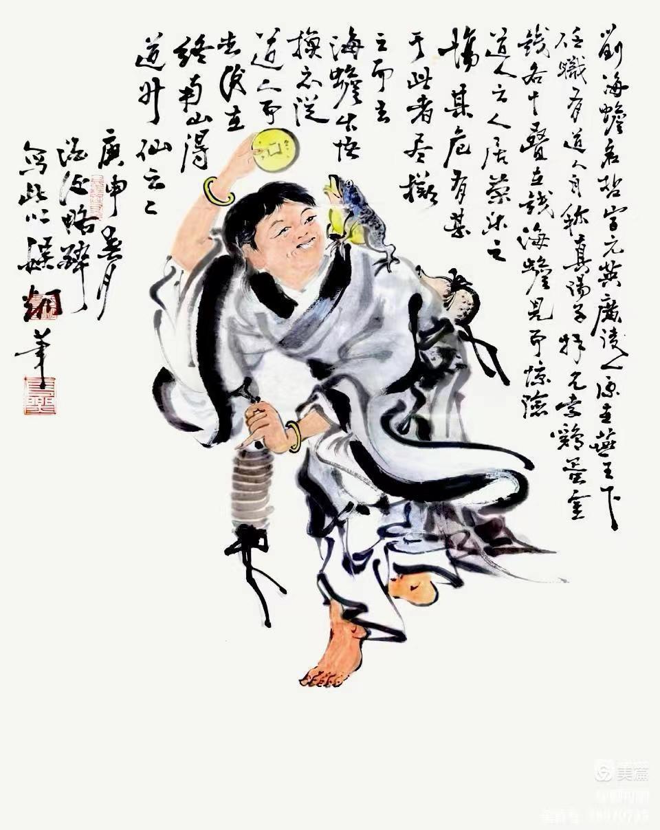 题为《刘海戏金蟾》的人物作品,用相当洒脱的笔墨呈现出充满趣味的美学世界。此画有中国古代名画《泼墨仙人图》的传承脉络,展现出当代大写意人物创作的传神魅力。刘海手持金钱,肩载金蟾,在动态中取平衡,构图空间十分巧妙,画旨寓意相当吉祥,和谐之相大悦人心,财源滚滚扑面盈怀,让人赏心悦目,这是中国传统绘画历久弥新的主题。