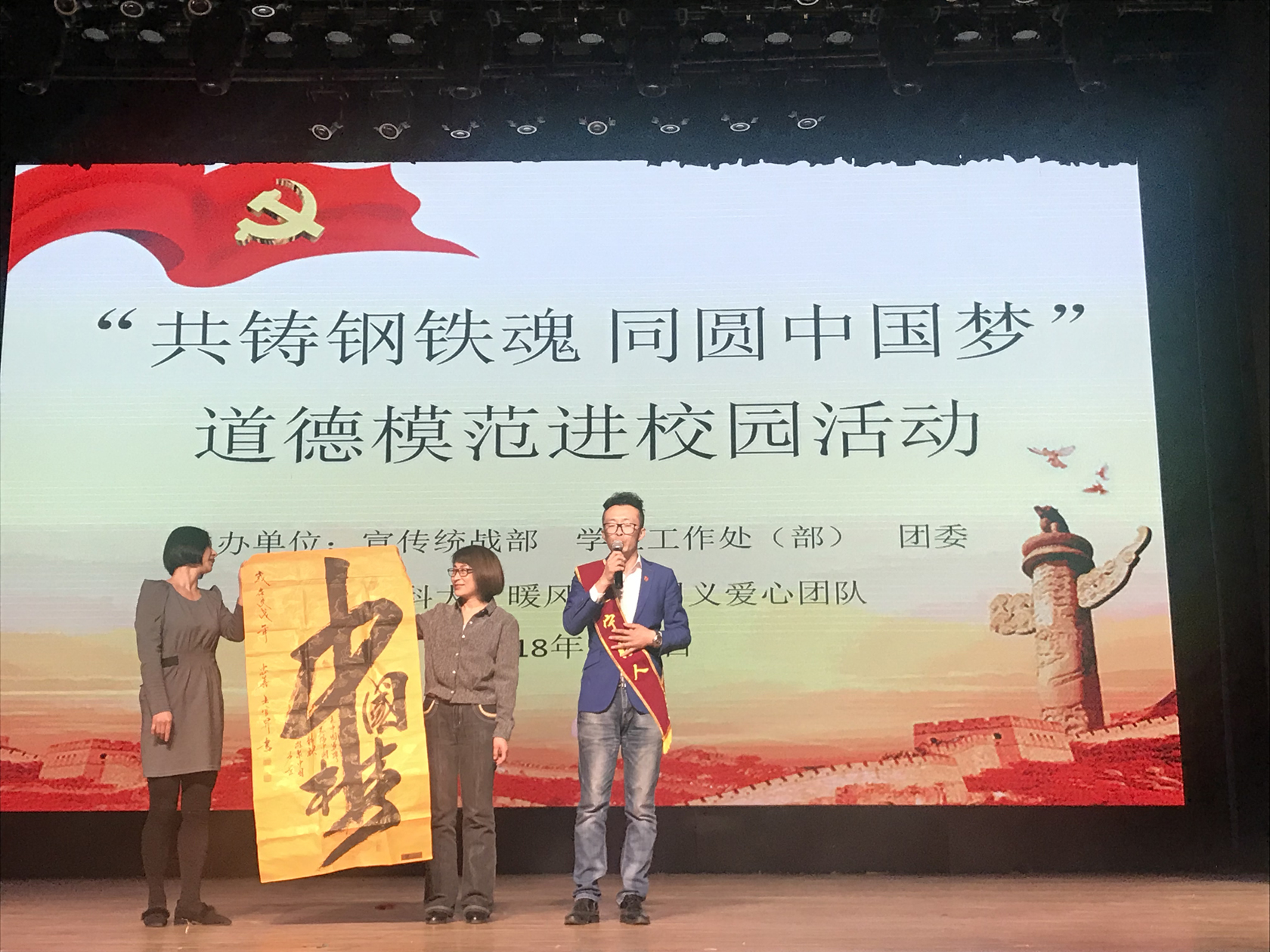 王官升在被辽宁科技大学受聘为校外指导老师仪式上,赠予该校《中国梦》书法作品