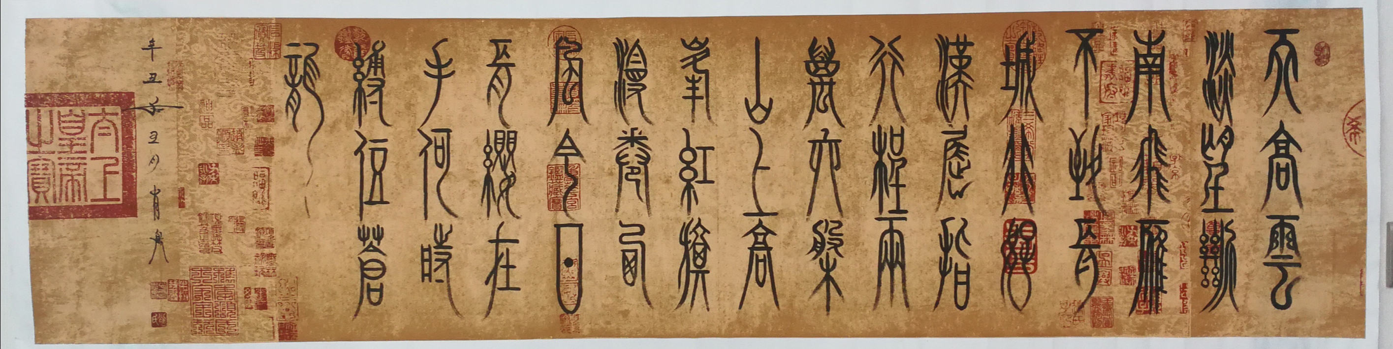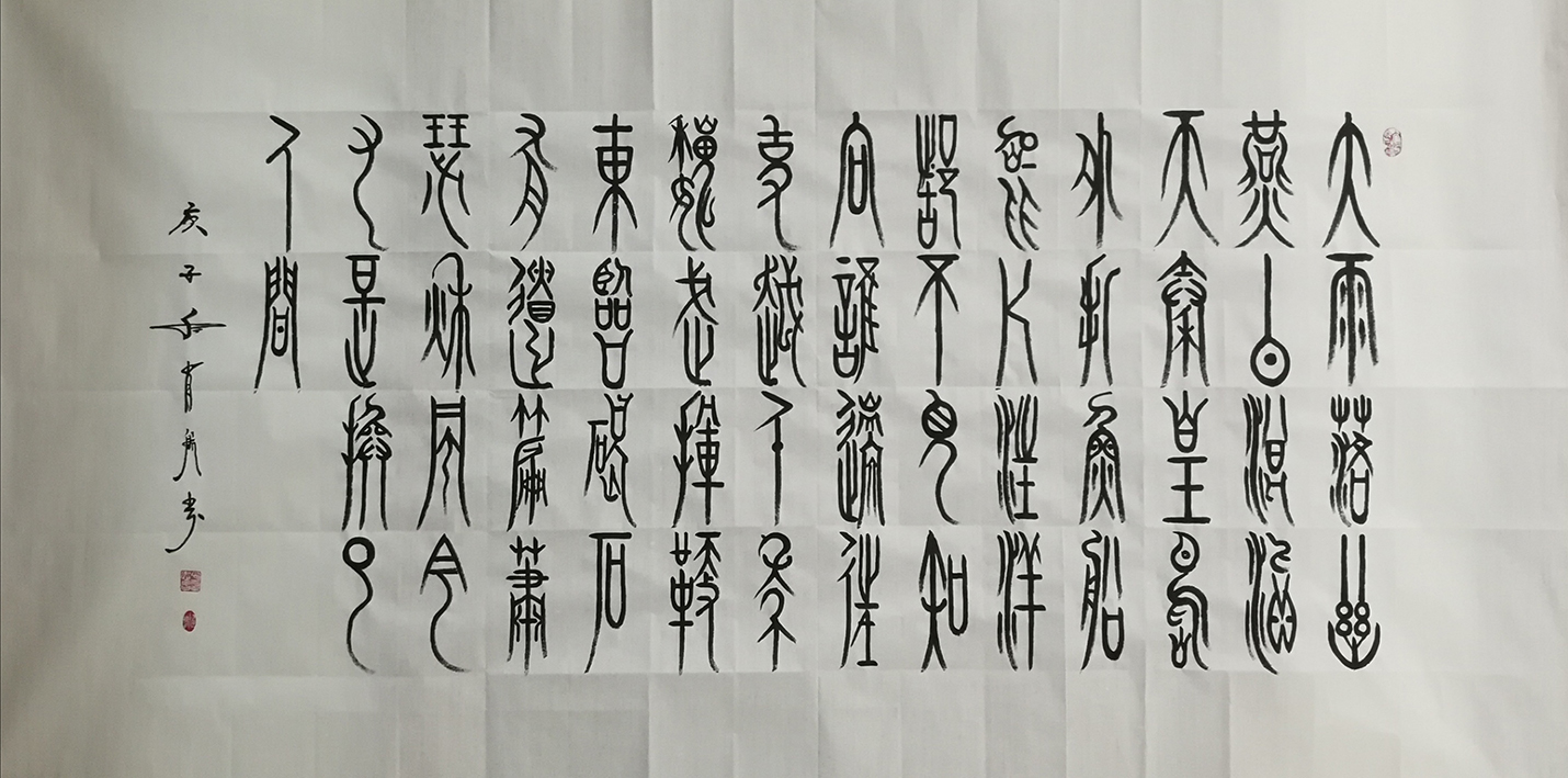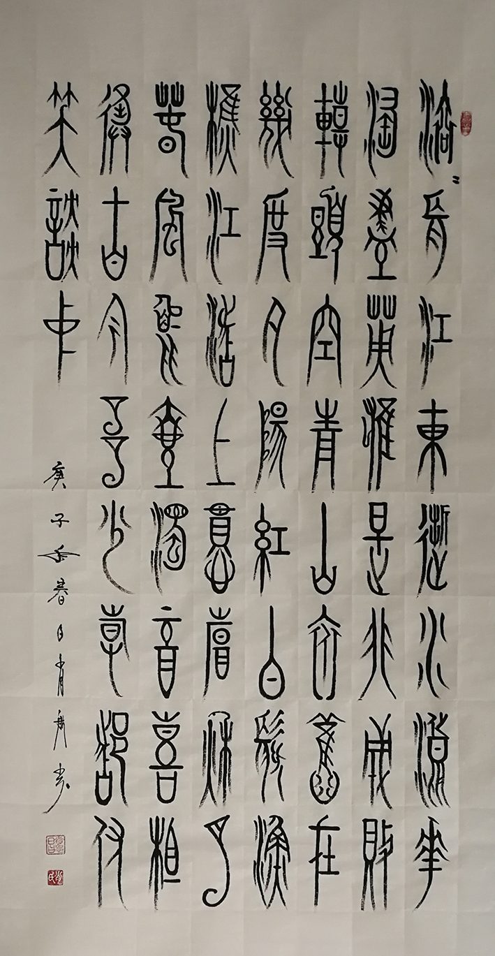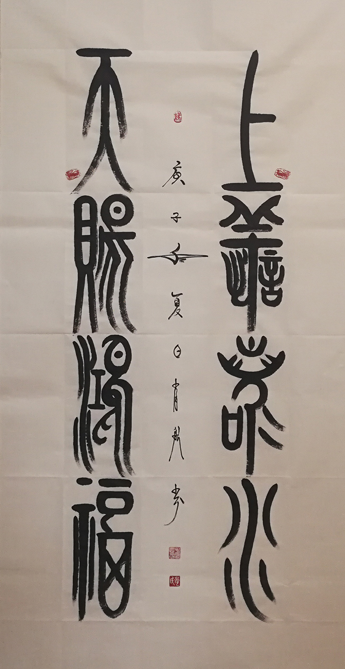铁笔龙梅绘丹青,法归石鼓书圆厚。吴昌硕用春秋不辍的痴念写石鼓,成为书法线条塑造的碑学前贤,肖忠昌先生的书法也有劲修高古的痴念,他以探源石鼓为执着,心追手临,付力深刻,所以书法线条圆厚朴茂,在堂皇大度的结体形态中,参意进笔法圆活,墨韵奔放的再创造,刚柔相济,飞白有现,质雄不失逸气,凝重而绝不写呆板!笔墨才华源出先贤,书画两功传承龙脉,肖忠昌先生恰是师古而不拘泥的书画雄才!