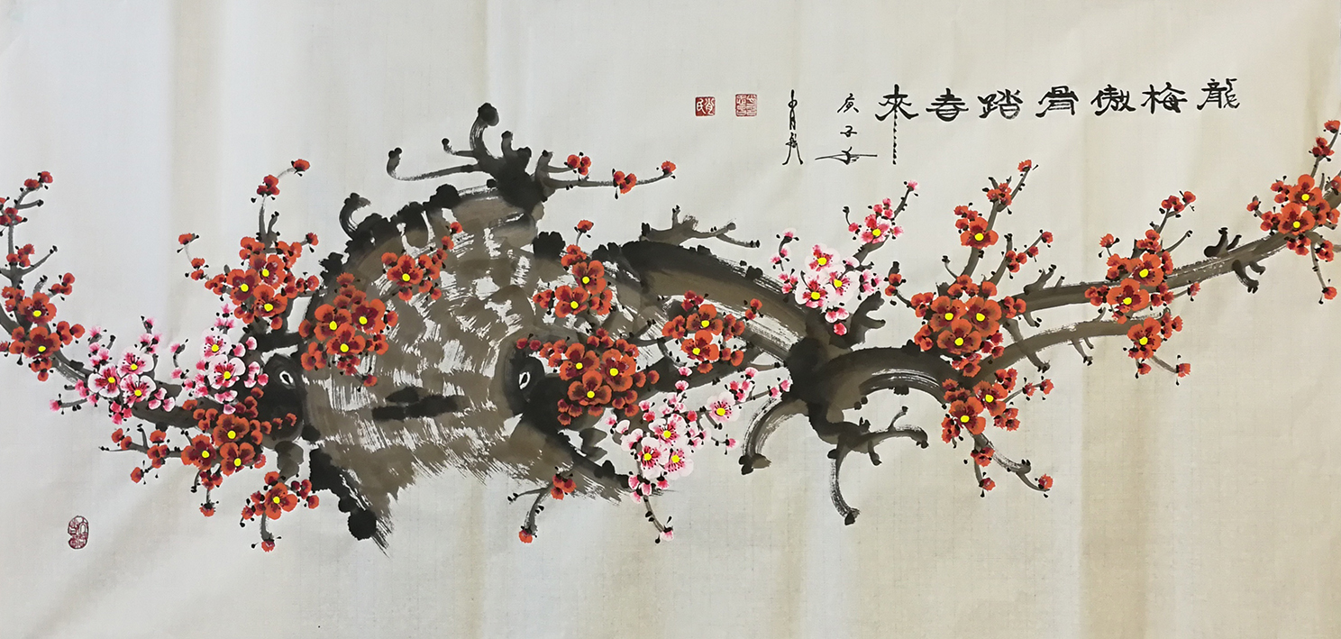 他把龙的形态,铁的质感,跃的动感全方位地融合在一起,用极具穿透力的笔法,把梅枝塑造成龙身铁骨,铮铮劲观。意在笔先,中锋勾勒,铺毫腾转,能疾必疾,当止则止,强大的笔管控制力,让梅枝线条依从心绪输出,放手写心,所以梅枝形态就有超自然的构造,盘而蓄势,舒而释劲。盘枝的力度生于主观,不失客观,达到势蓄最满,拥有强劲的爆发动感,成为空间里的雄风奇观。